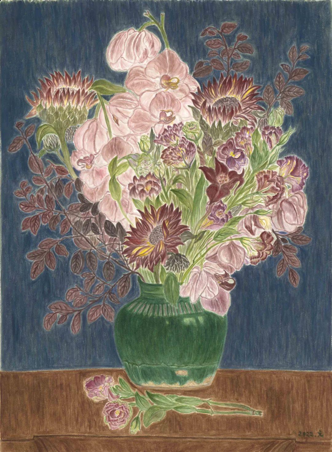 儿子博士毕业,朋友送来一束好大的花,她决定挑战一次画画以来的大尺寸,两张纸拼在一起,让每朵花都可以展开。前后忙活了半个月,作为给儿子的毕业礼物。