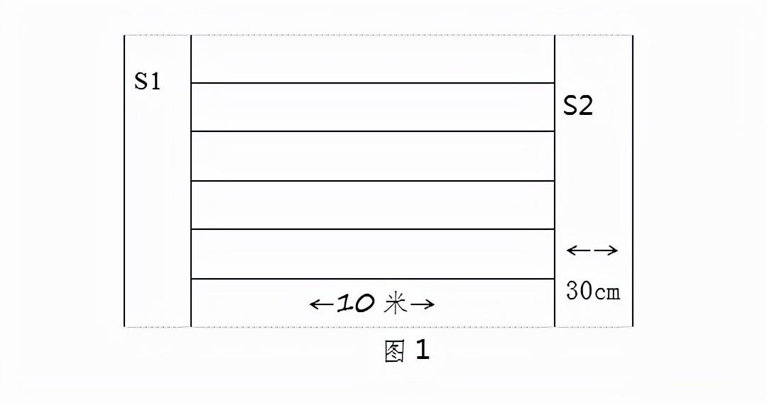 场地器材:10米长的直线跑道若干条,在跑道的两端线(S1和S2)外30厘米处各划一条线(图1)。木块(5厘米×10厘米)每道3块,其中2块放在S2线外的横线上,一块放在S1线外的横线上,秒表若干块。