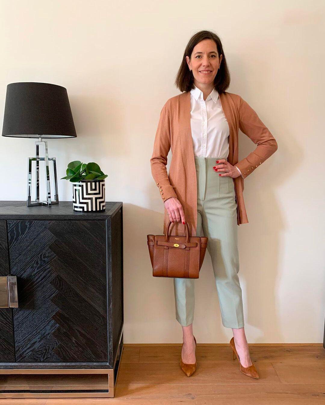 正如上图这套Look:白色衬衫和驼色开衫都是再文雅不过的职场感单品,但是下装换成薄荷绿色的九分西装裤,瞬间就有一股清新文艺的气息扑面而来,轻松搅动时尚风云。