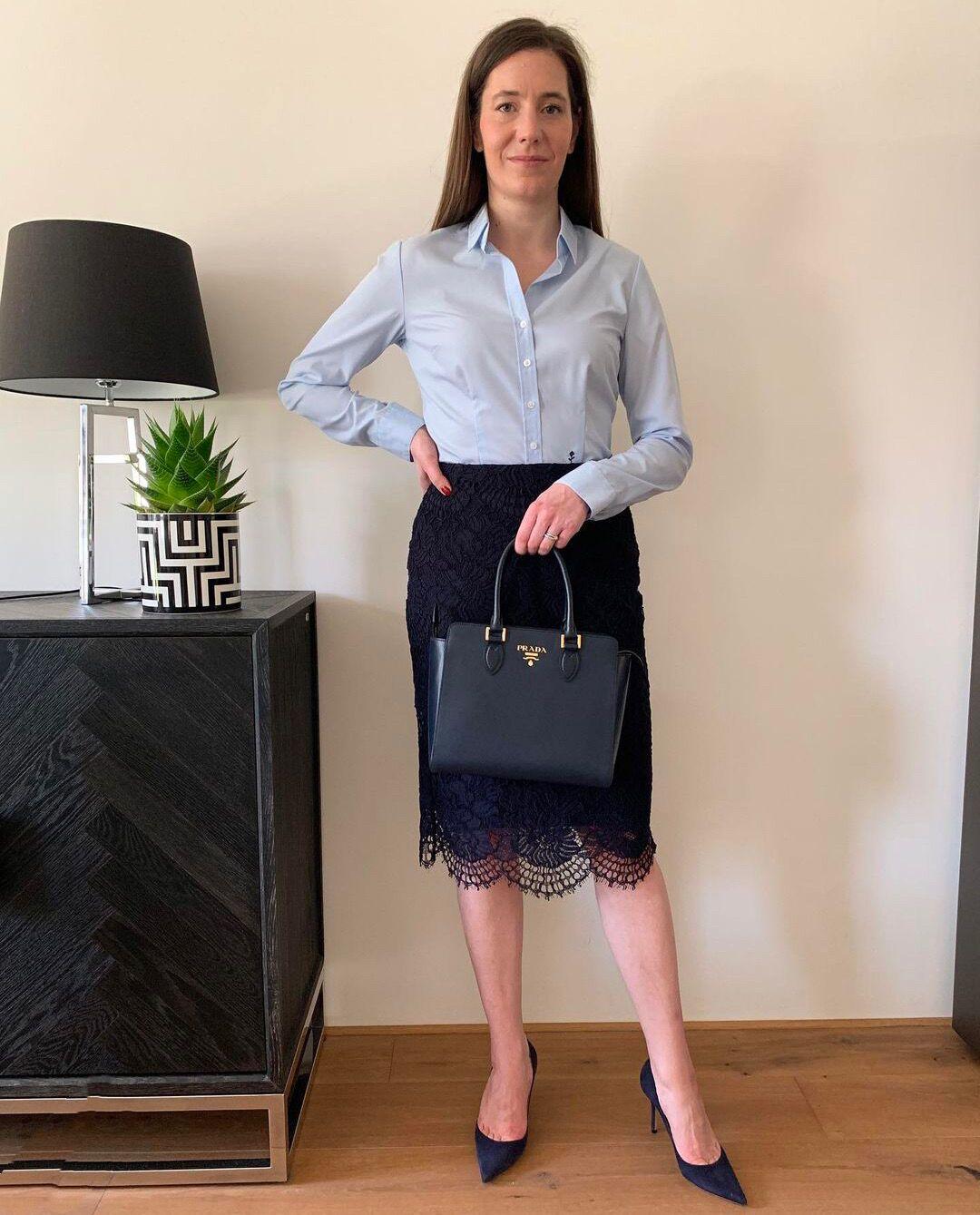 一件合身合体的正式感蓝色衬衫,讲究的一件单品,干练的线条配合着利落的轮廓,唱响沉稳大气的主旋律,下装不配正式西裤,而是搭配一款黑色的蕾丝半裙,与上衣共同勾勒出一份优雅妩媚的精致感。