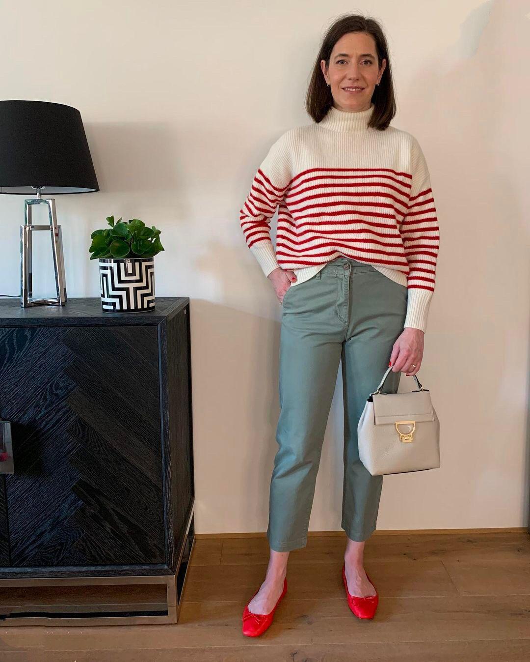 比如:红白条纹毛衣与深绿色的烟管裤,慵懒随意与干练得体两种风格融合得天衣无缝的,带来一种浑然天成的女性魅力。