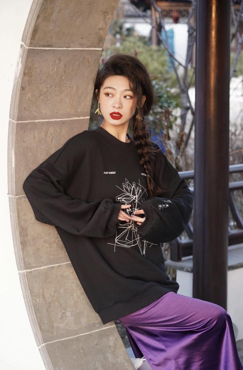 后为你推荐的是一件黑色的卫衣,它的版型宽松,但采用了无帽设计,所以不会太学生气,反而会塑造出慵懒的女人味,大家可以借鉴博主造型,搭配优雅的麻花辫,这样整体风格会更鲜明。