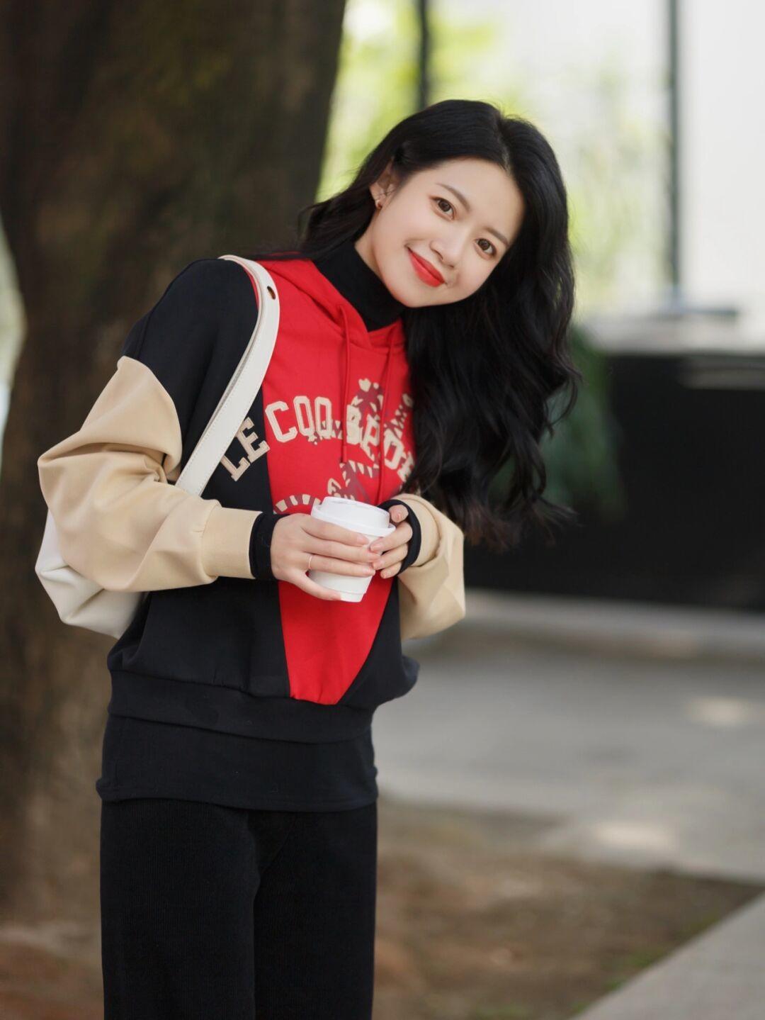 首先为你介绍的是一件拼色款的卫衣,相比较普通卫衣来说,拼色款在造型上会更有超前感,整体以红色与黑色为主色调,稍微拼接了淡黄色的袖口,三个颜色分布均匀,所以不会显得头重脚轻,反而很大气,三个颜色都是显白的颜色,不会有穿搭上的压力,