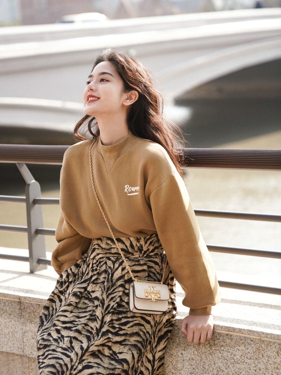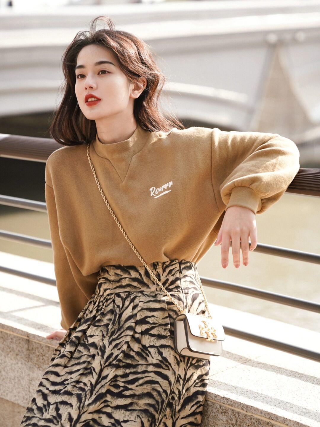 对于熟女来说,无帽卫衣的可搭配也超强,因为可以朝着知性优雅的方向去打扮,所以可供选择的款式还是比较多的,我们可以来看看下面这个造型,驼色卫衣质地厚实,搭配虎纹半身裙就在色彩上形成了呼应,大大提升了整体的协调度,显白又优雅。