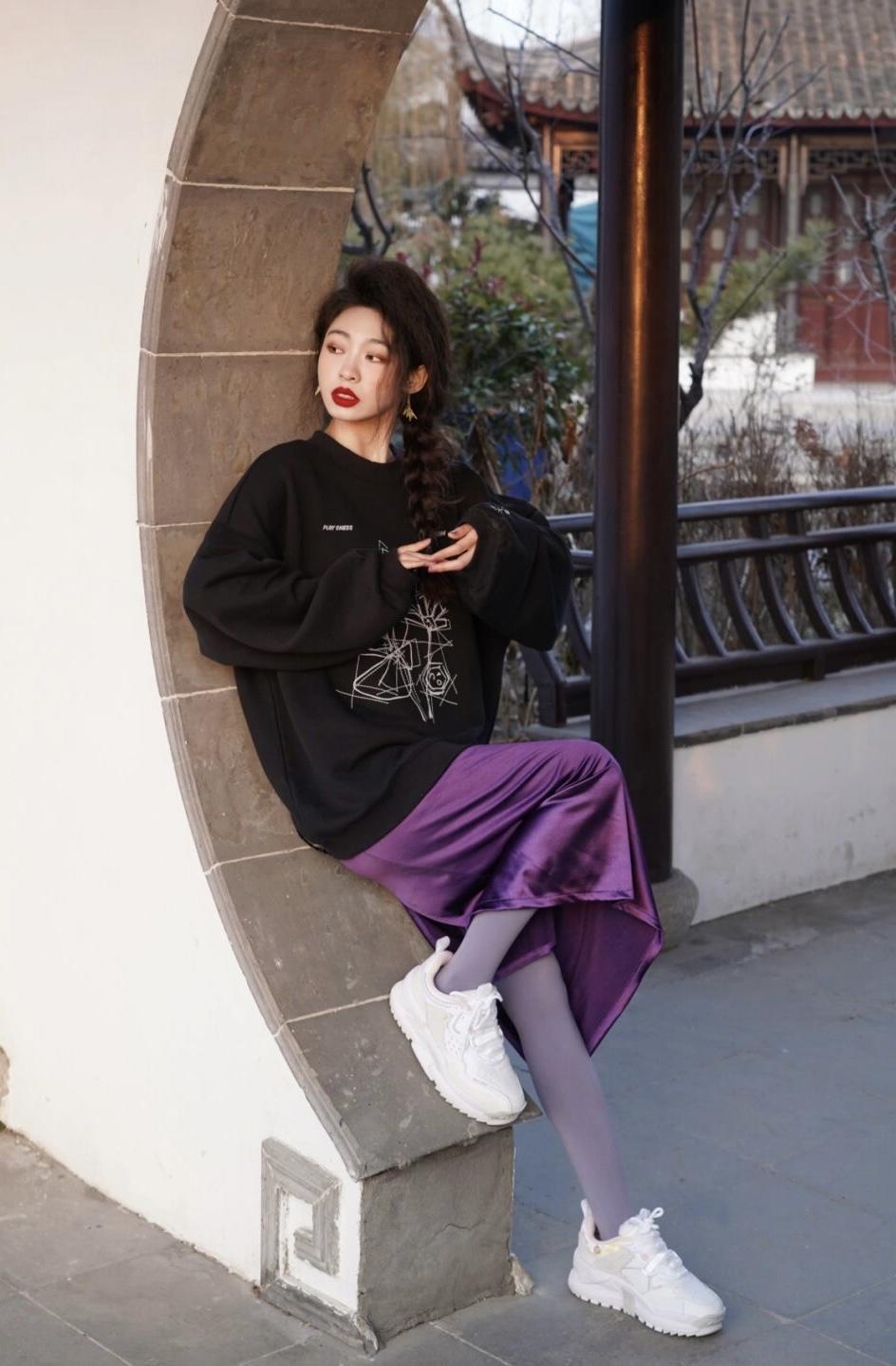 搭配紫色丝绒半身裙是不错的选择,毕竟紫色神秘幽静、适合成熟女人,而丝绒质地高贵,调和了卫衣的休闲,如果怕冷,就搭配一双紫色的打底裤,这样更保暖。