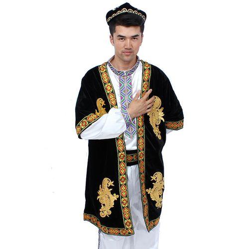 维吾尔族男装 男装比较简单,主要有雅克特(长大衣)、托尼(长袍)、派特(短大衣)、尼姆恰(外套)、库内克(衬衫)、腰围等维吾尔族人统称外衣为玉环。男装上也绣有图案,主要在领子、胸部和领口处,显示出维吾尔族丰富的装饰美。它不仅优雅又时尚,而且穿起来也很方便。配以蓝色长裤和皮靴,融入丰富的民族服饰特色,充分展现青春活力和健身精神。