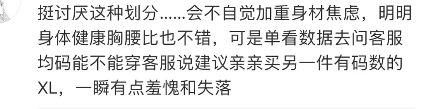 尺码偏小不光事关能不能买到衣服。穿衣码数暴增、被店员说“没有您能穿的号” 、甚至直接被拒绝试穿对很多年轻女性来说难免会产生“我太胖了”的想法,甚至是其他负面情绪: