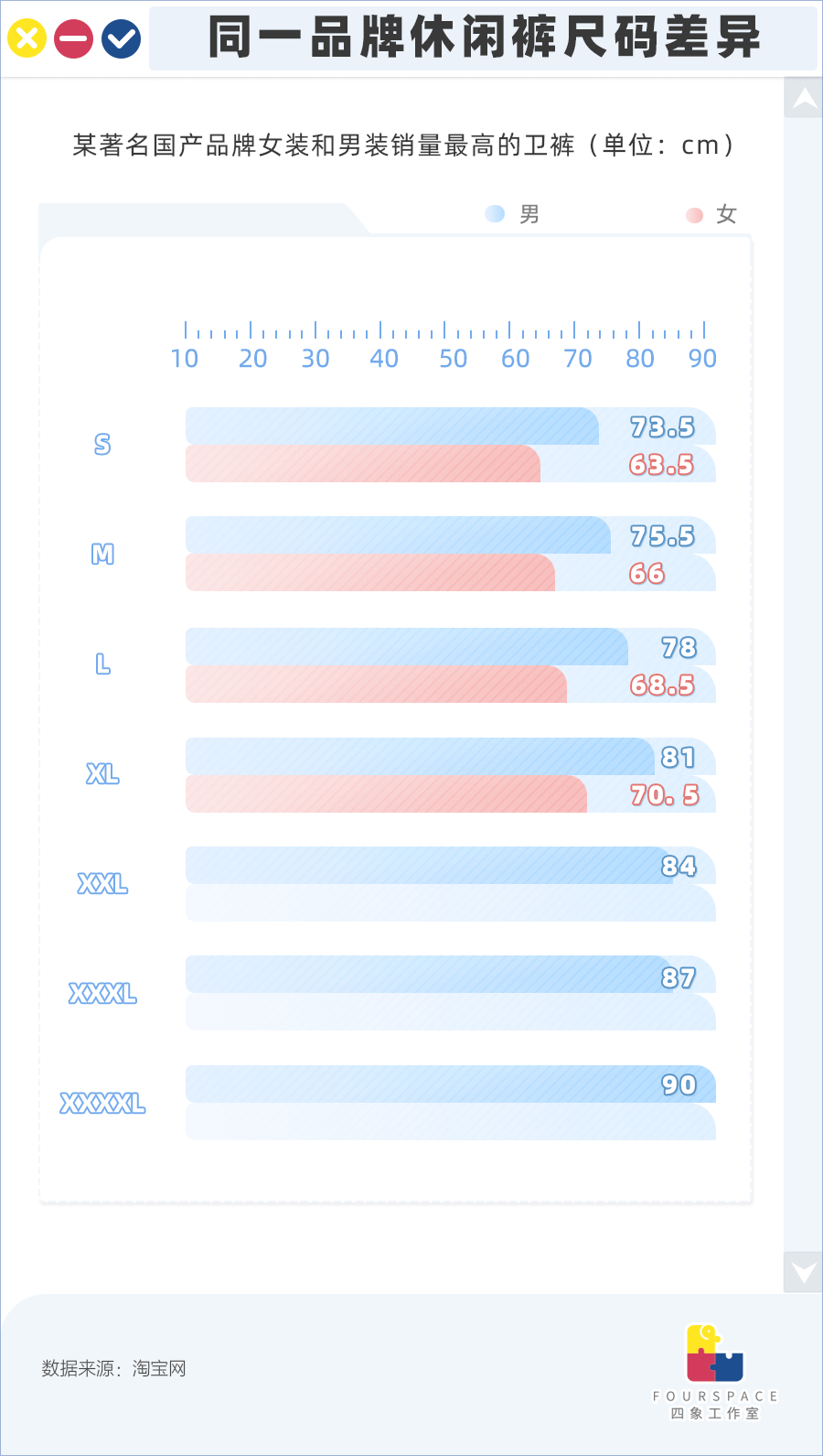 对比女装店铺和男装店铺里销售量好的卫裤尺码可以看出,男款卫裤分了7个尺码,大小码腰围相差16.5厘米;而女装只有4个尺码,大小码差7厘米。男装不仅填补了女装缺失的所谓“大码”,尺码选择也更多,这也就不能怪众多女生对男装“真香”。