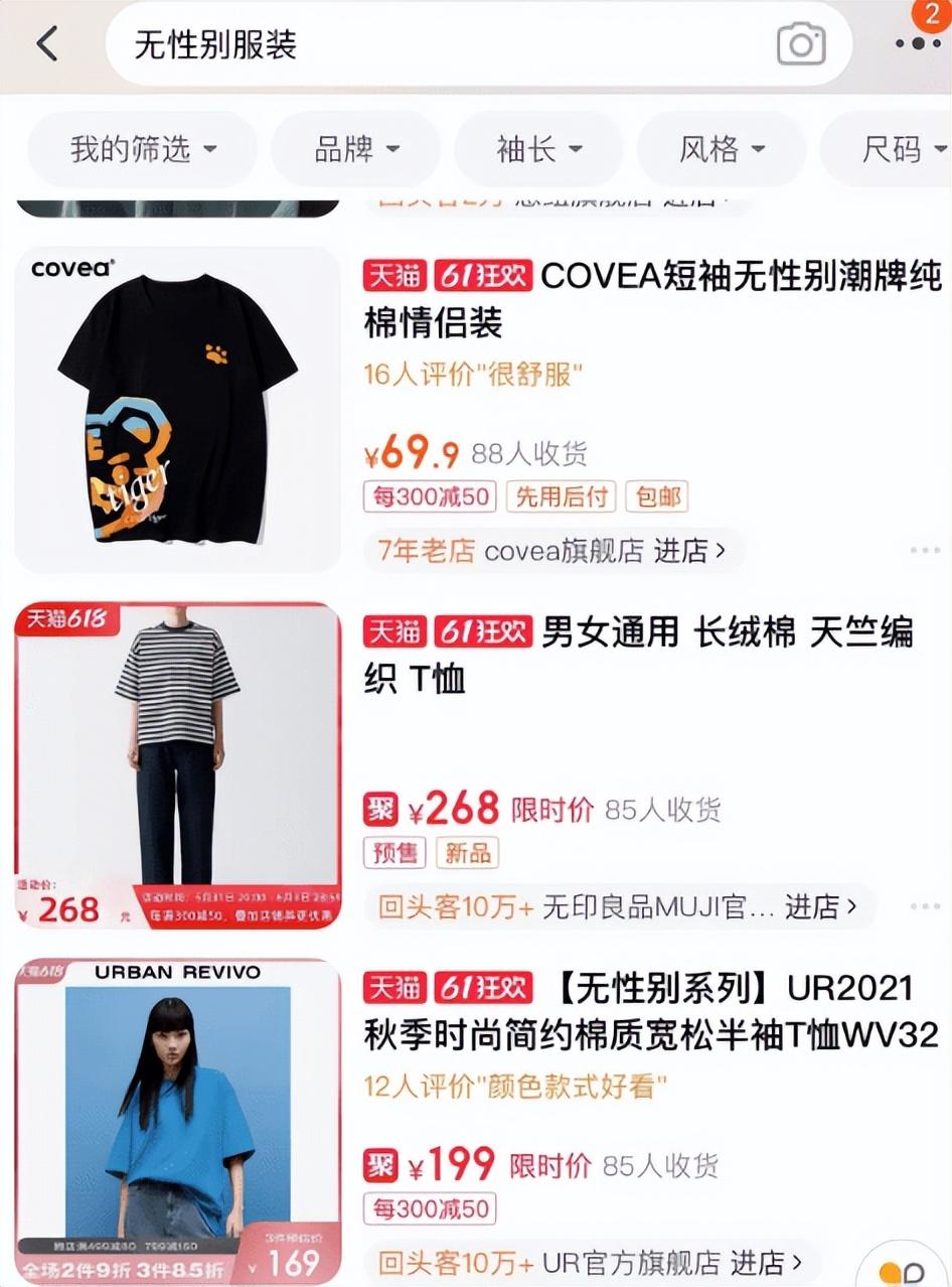 这里我们也发现了一些有意思的现象,店家售卖“男女同款”的无性别服饰时似乎更青睐将其分类到男装区。