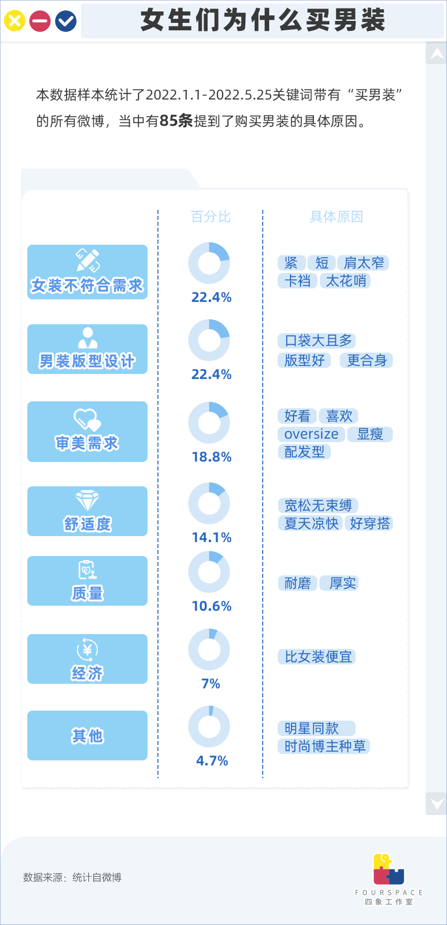 四象统计了与“买男装”有关的微博,从中挑出了女生们给出的各式原因。答案中,多的是对女装不爽的“拉踩”。
