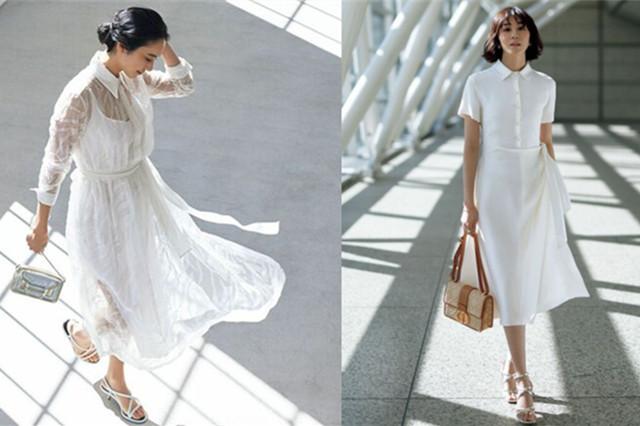 左图: 白色本身就带着时尚的光环, 一条女人味的紧身裙,如今选择了本白色,上衣本身T 恤,外加一件白色针织衫披搭在肩上,给人精致感的白色,与棕色包包和金色鞋子搭配,休闲的高贵感马上体现出来。