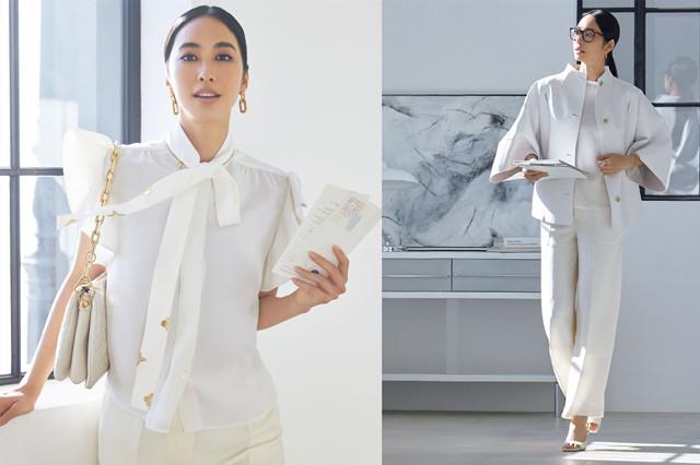 左图:解说应季的配色,就是白色,关键是要将精细分层的面料,与高时尚的细节结合起来,能体现出细腻层次的灵性,让职业女性的穿搭尽显优雅气质。端庄的白色,透明光泽的长衬衫,散发出纯粹的光泽,丰富度就翻了一番。