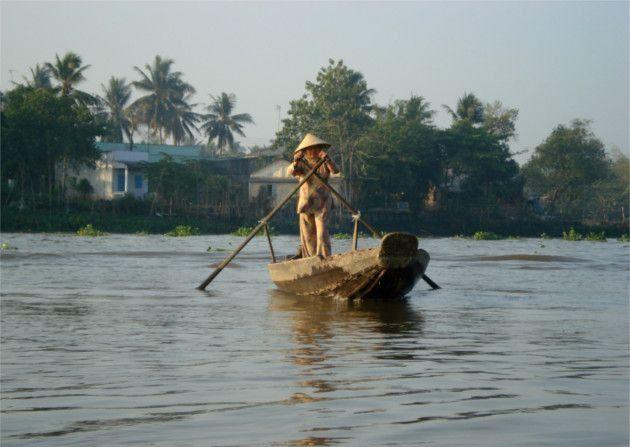 湄公河三角洲戴传统锥形帽的妇女