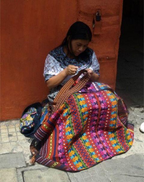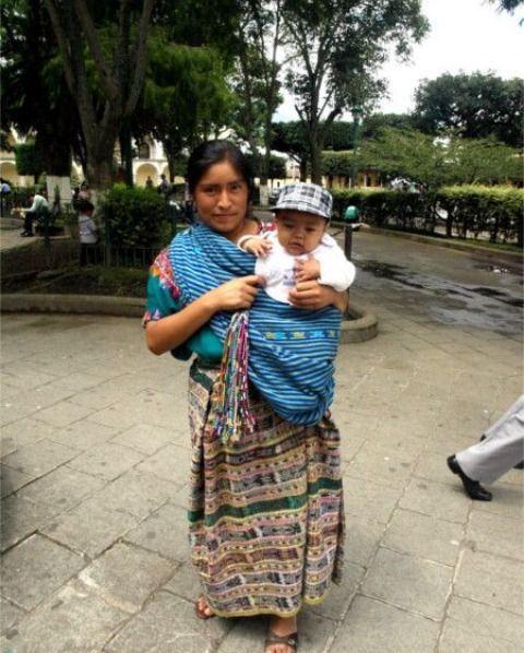 在危地马拉,衣服颜色很鲜艳。孩子总是被包裹在母亲身上的织物中。
