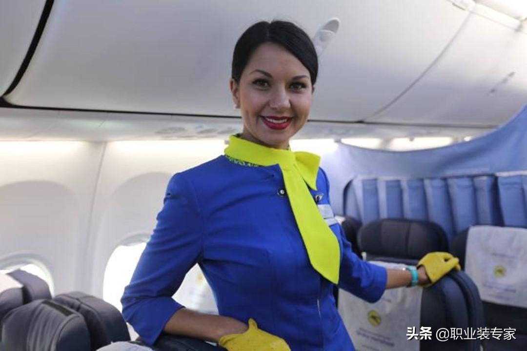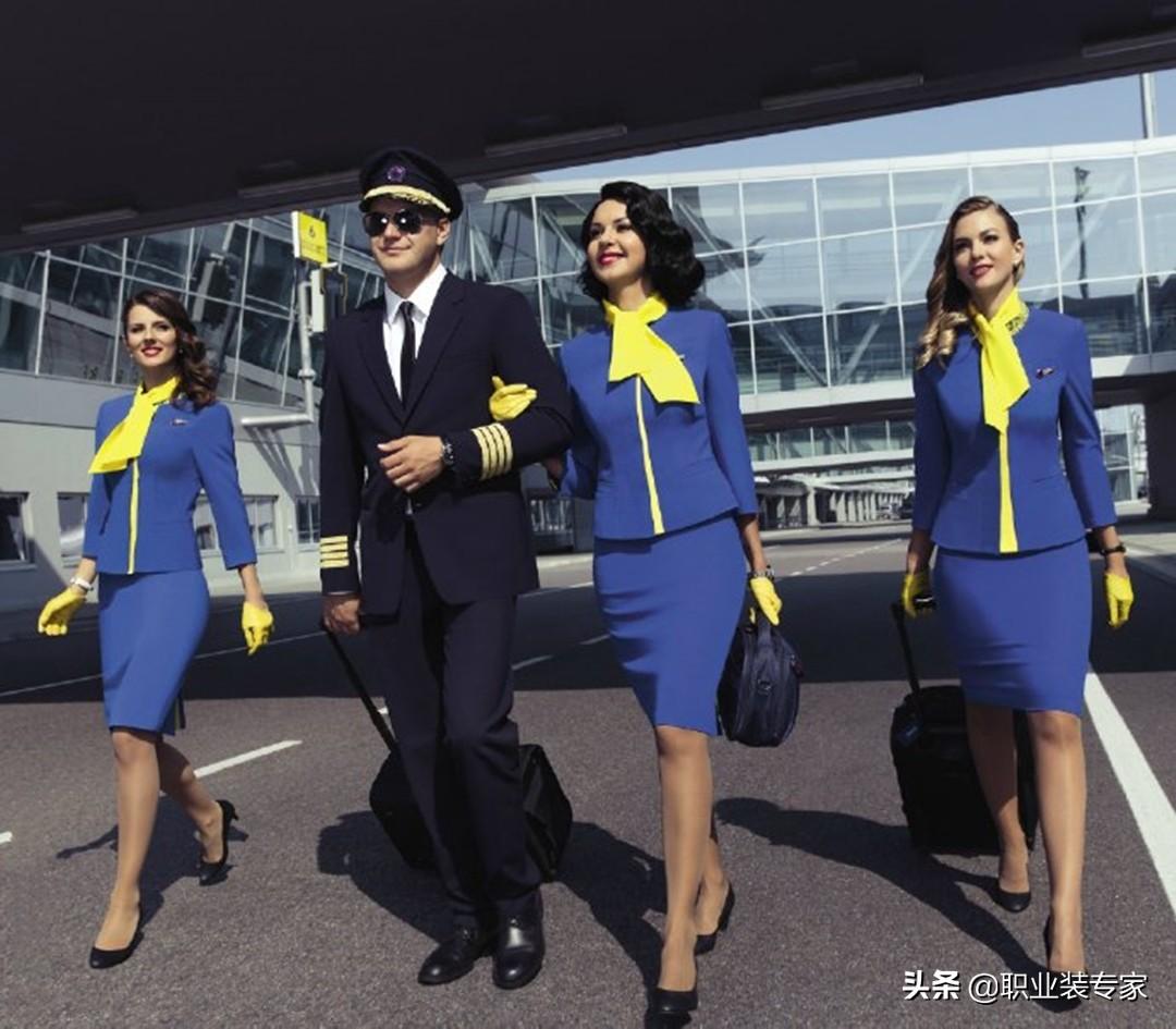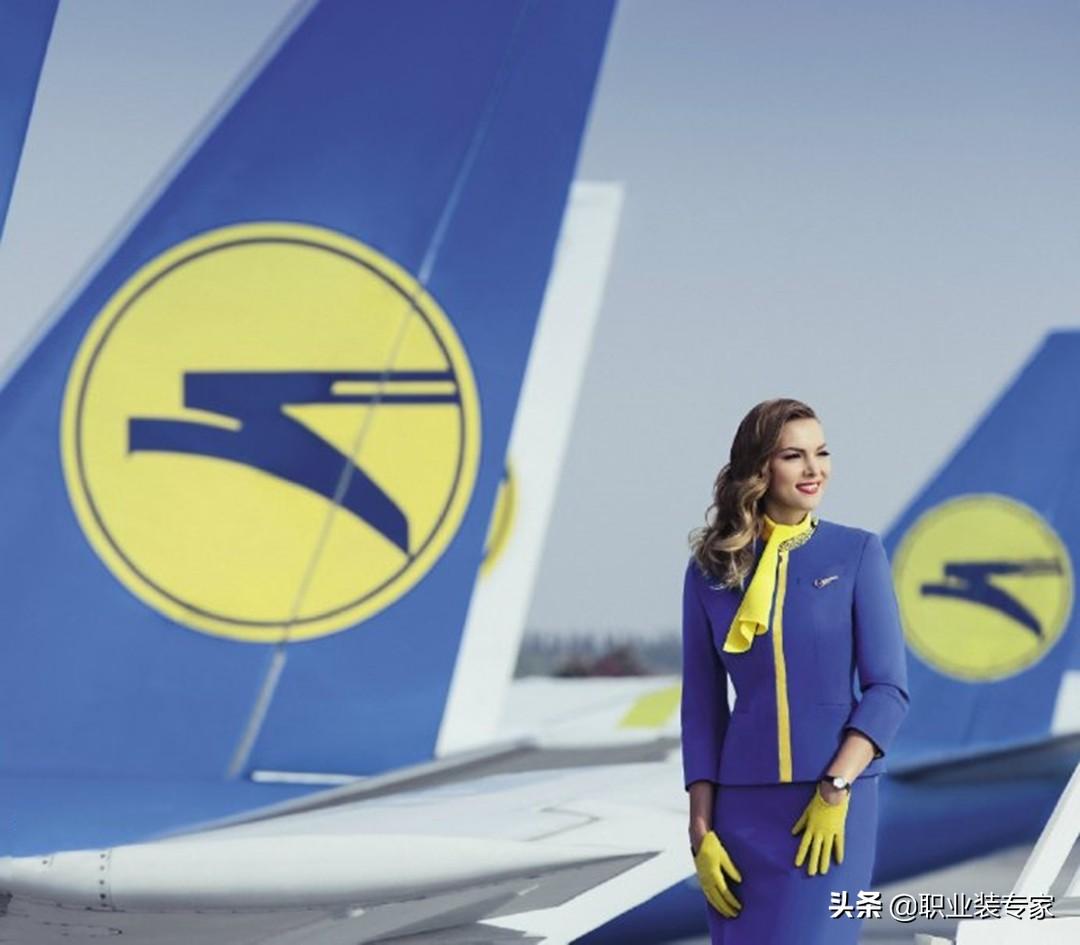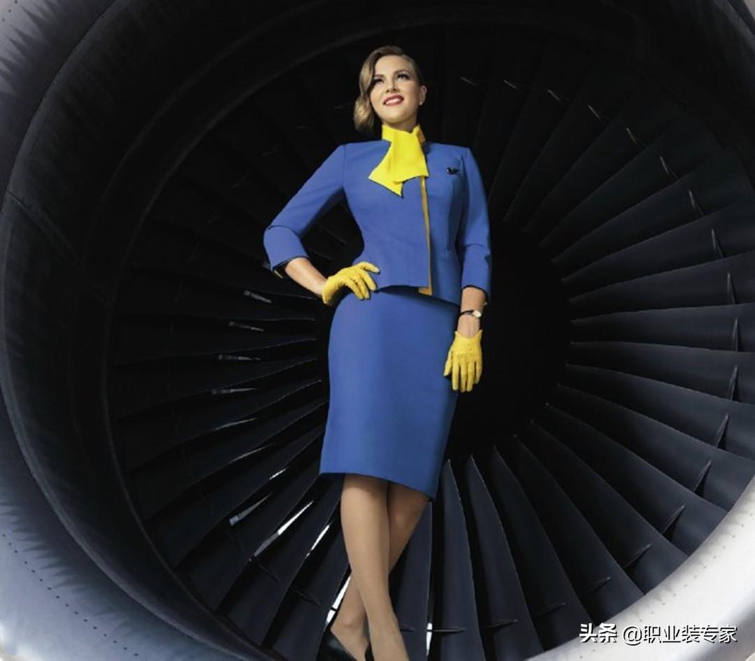 高颜值的乌克兰空姐,制服也是别具一格的靓丽感,大胆的宝石蓝颜色,同柠檬黄形成鲜明的对比。
