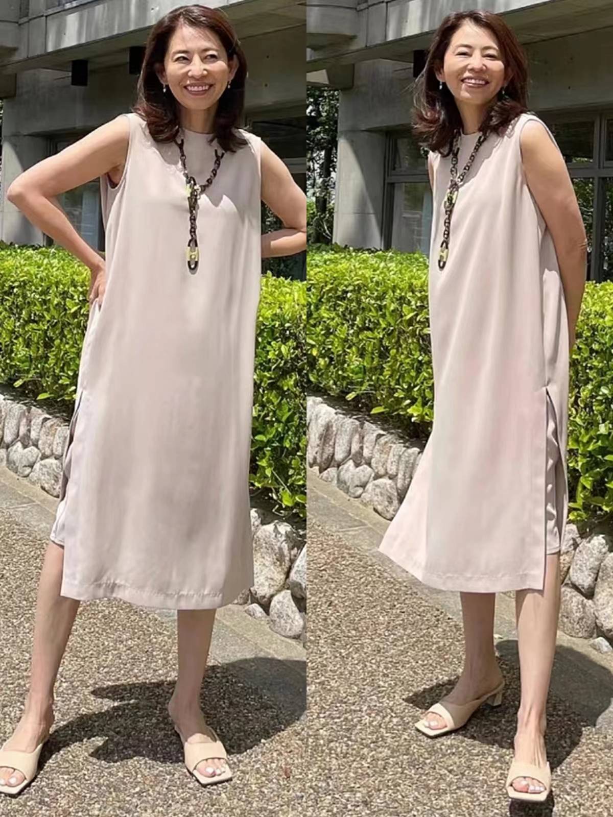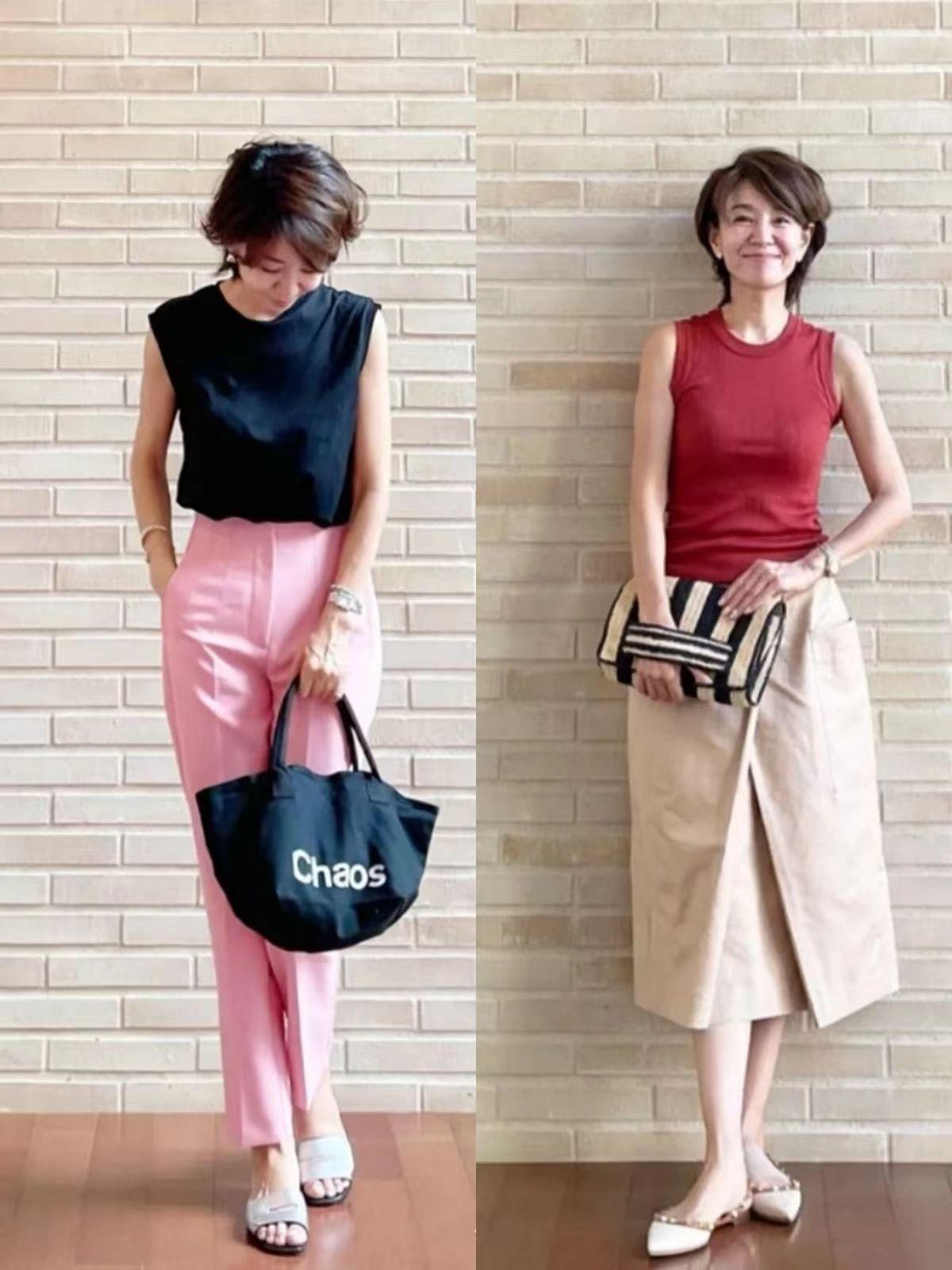 老年装要么堆满了老气花卉图案,要么宽松没有版型,这些在日本主妇身上都很少见。她们更喜欢能够凸显身材优势又足够得体的服饰,比如坎肩背心或者露肩背心。