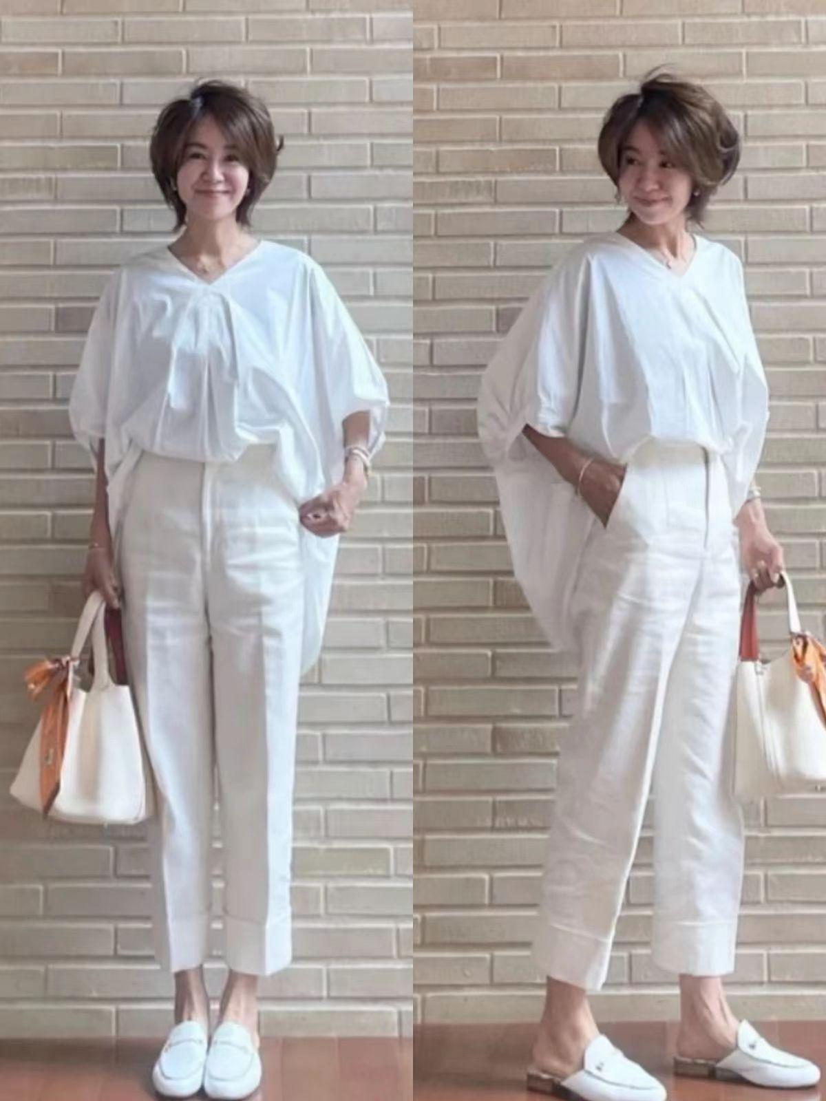 上了年纪的日本主妇在挑款上,大多秉持着简约舒适的原则,各种款式简洁的无龄感服饰出镜率很高。比如纯白色T恤,这些纯棉T恤透气舒适又百搭,穿在身上特别显年轻。