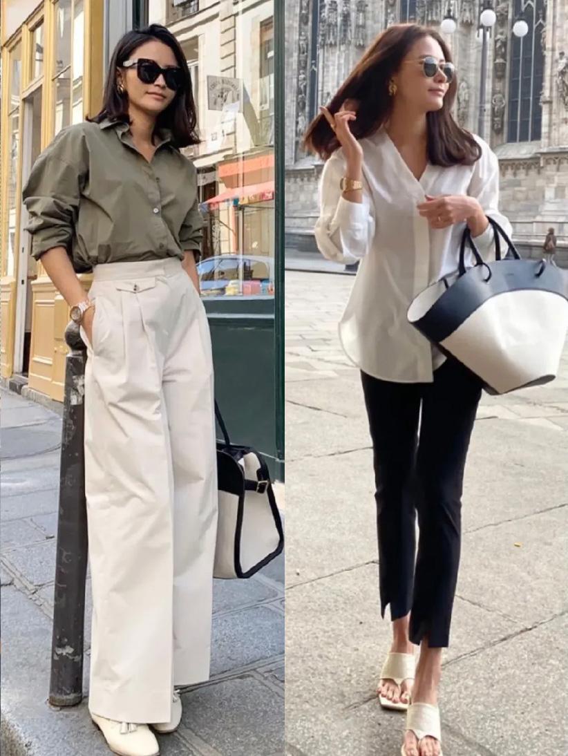选择长裤的话,首先建议大家挑选阔腿裤和九分裤,可以帮助姐妹们轻松打造出高挑身材,更好的将腿部线条呈现出来。