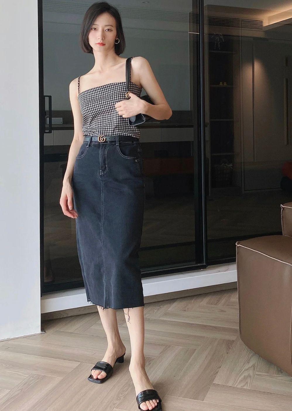 格纹抹胸吊带+牛仔半身裙=秀出好身材