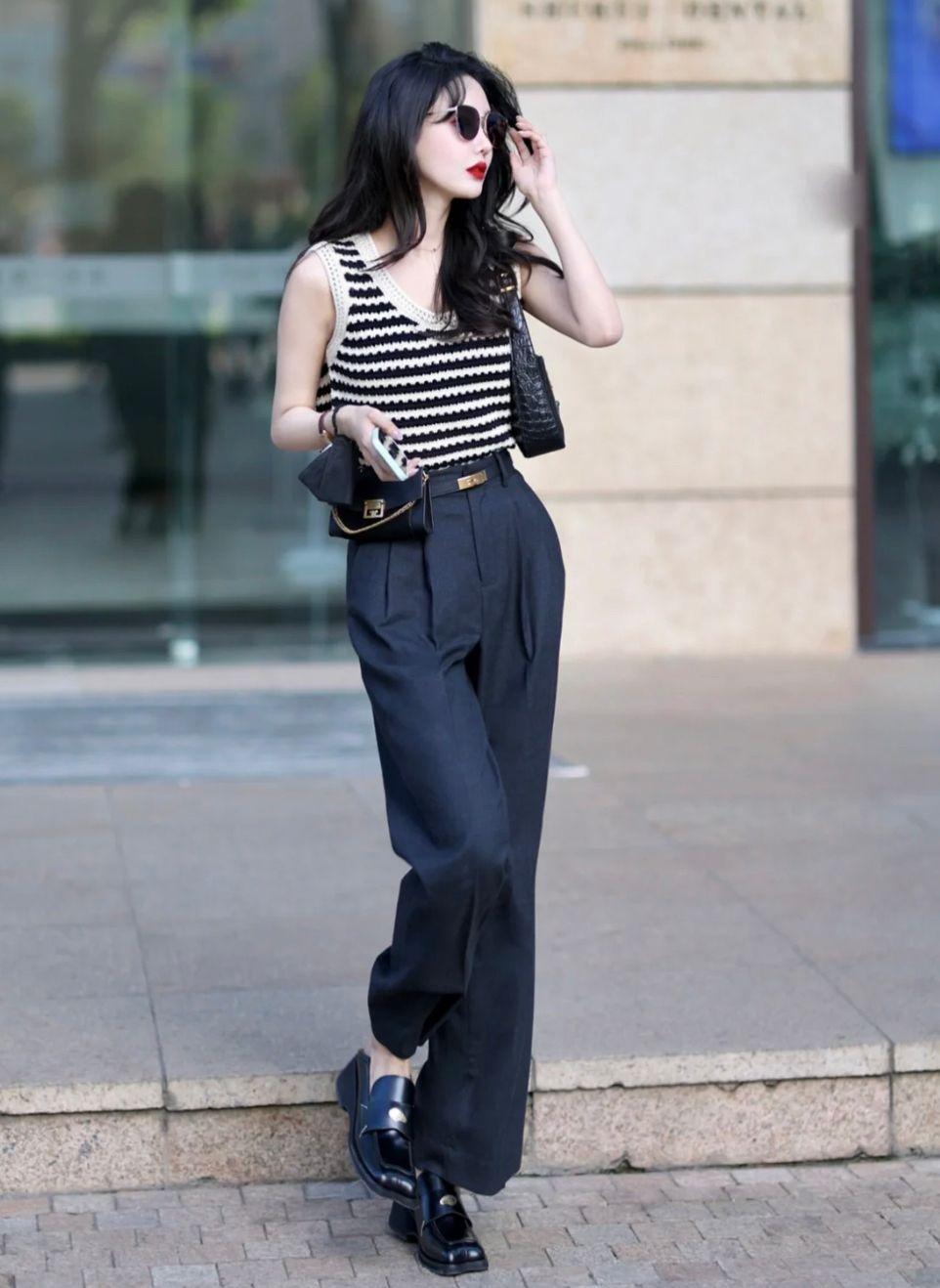 想要让整体的造型看上去更加具备平衡状态,就一定要遵循“繁简结合”的搭配公式。上半身可以采用条纹元素的针织背心,下半身就要搭配一款纯黑色的高腰阔腿裤,针对腰部有赘肉的类型,可以配合上腰部捏褶的设计,却隐藏住赘肉感。