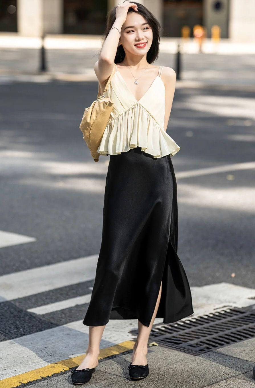 V领吊带木耳边背心+丝绸开衩裙=视线上移