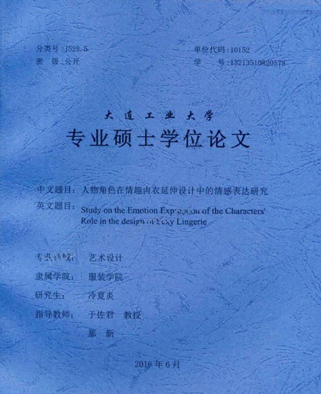 5月7日,澎湃新闻记者通过爱学术等论文数据库查询到了这篇来自大连工业大学服装学院艺术设计领域的论文,指导老师为于佐君教授,发表时间为2016年6月。论文共分为六章,分别是“绪论”“中西方内衣发展历程对女性思想的体现”“人物角色在情趣内衣设计中的情感表达”“新娘人物角色在情趣内衣设计中的创新研究”“新娘人物角色在情趣内衣延伸设计中的创新运用”和“结论”。