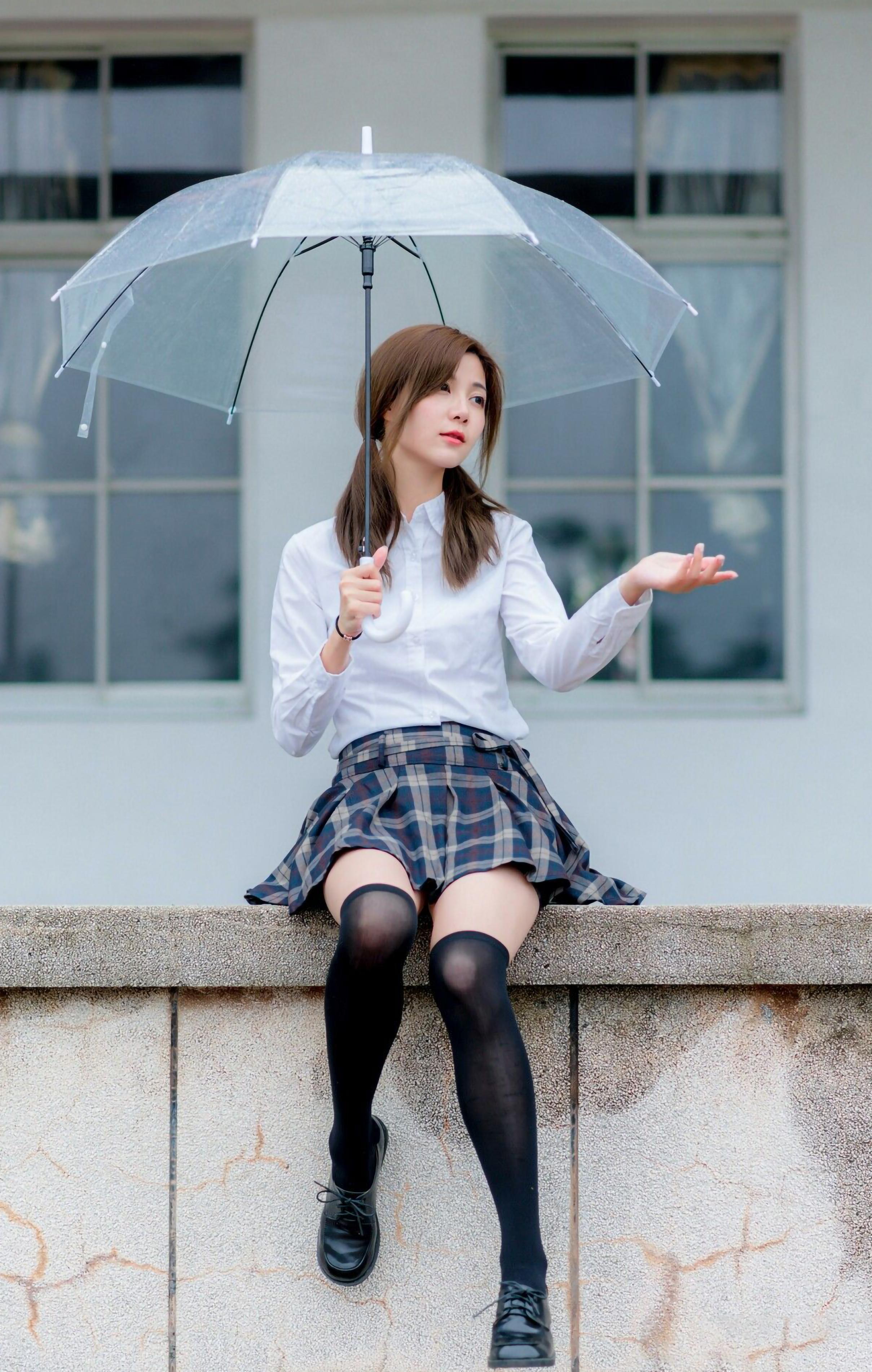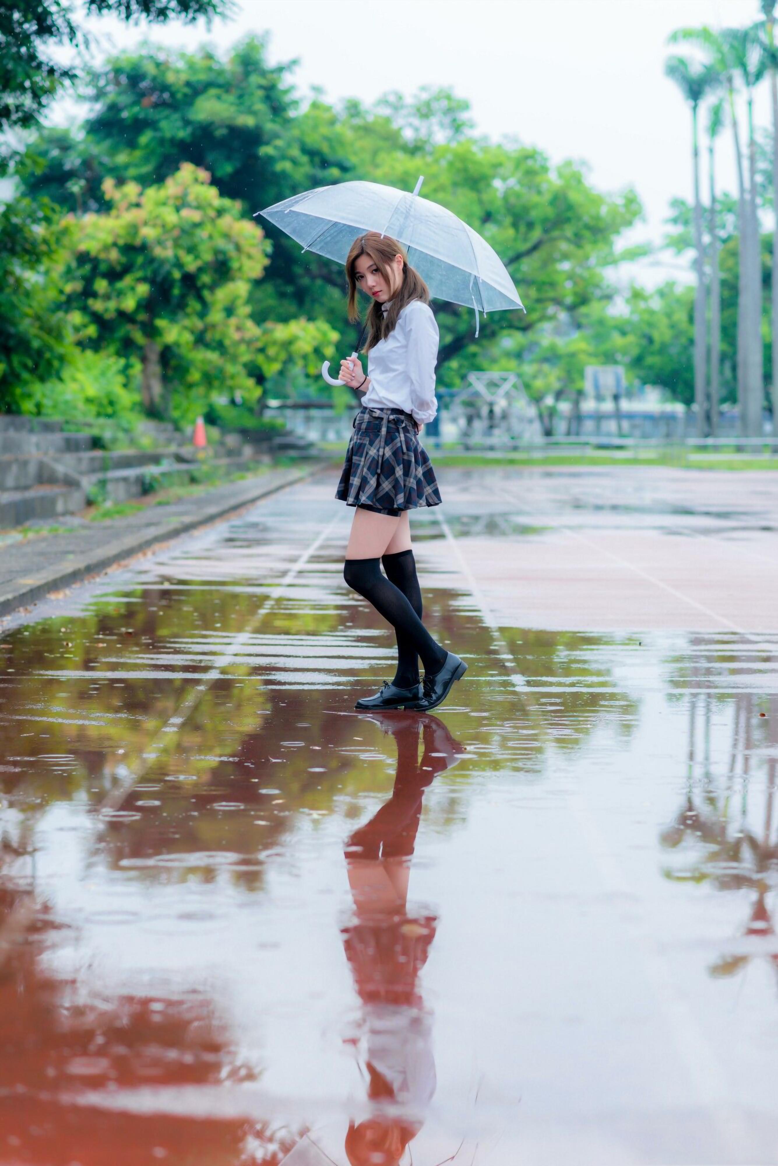 全景:雨中撑着透明伞的西式JK制服展示