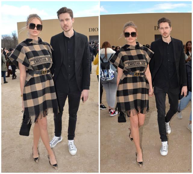 维密天使RomeeStrijd穿了一件格纹围巾裙亮相,这套造型把“肉米”的身材穿胖了两圈,还显老好几岁。