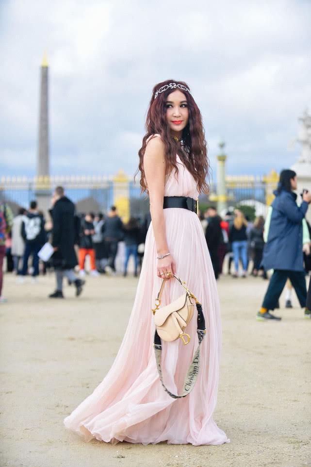 但是整体造型还是换汤不换药,是温碧霞爱的仙女风格,卷发搭配粉色吊带的雪纺长裙,腰带强调腰身,加上裙子里藏的高跟鞋,显得比例相当不俗;裸色马鞍包给这套仙女风增添几分休闲的街头感,这一身造型虽然不那么前卫时髦,妆发还有些过时感,但整体挺适合温碧霞的气质。