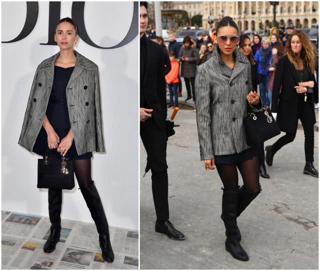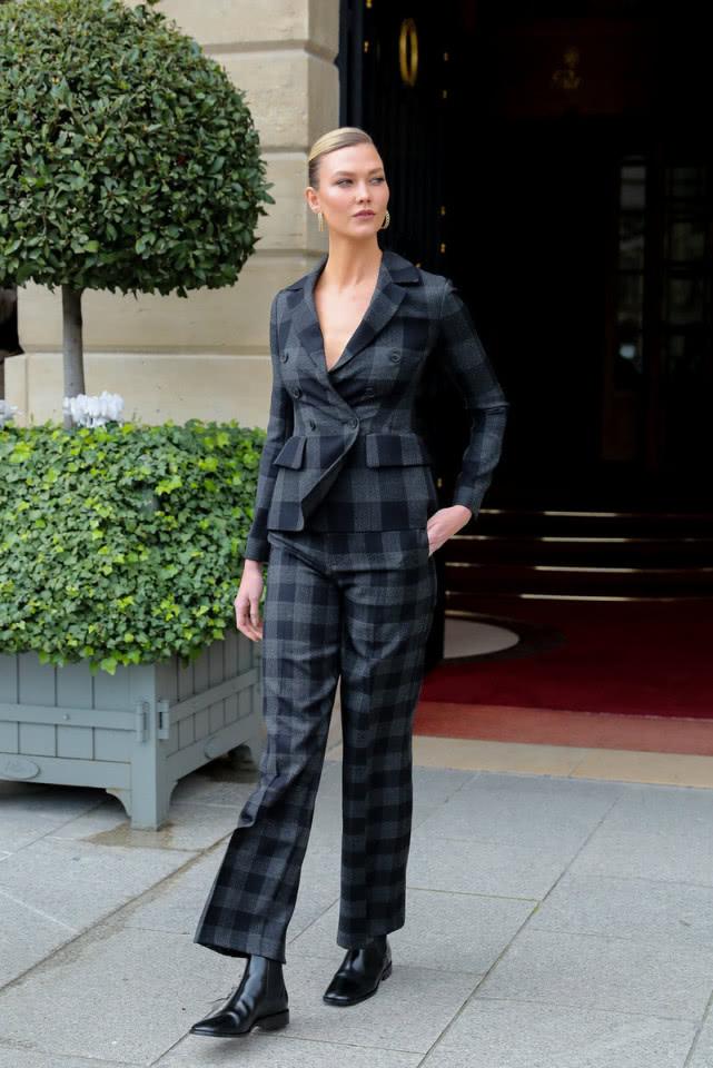 大长腿小KK(karlie kloss)这次穿了一套格纹套装搭配皮质短靴,出发的街拍果是这样的,上衣显得有些紧绷不说,整体画风像是下乡慰问的干部,而不是超模。