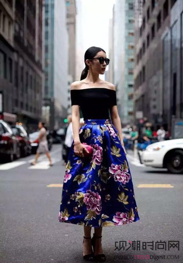 黑色收身露肩上衣,搭配蓬感印花长裙,又美又妖娆。