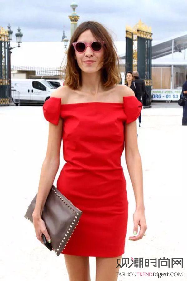 艾里珊·钟 (Alexa Chung) 的红色一字领露肩连衣裙,凸显雪肌白肤啊。