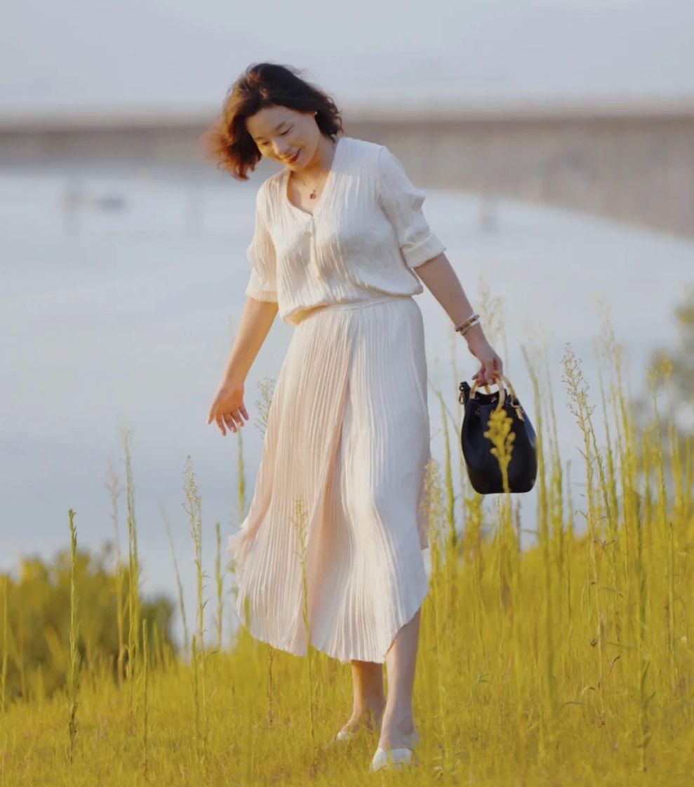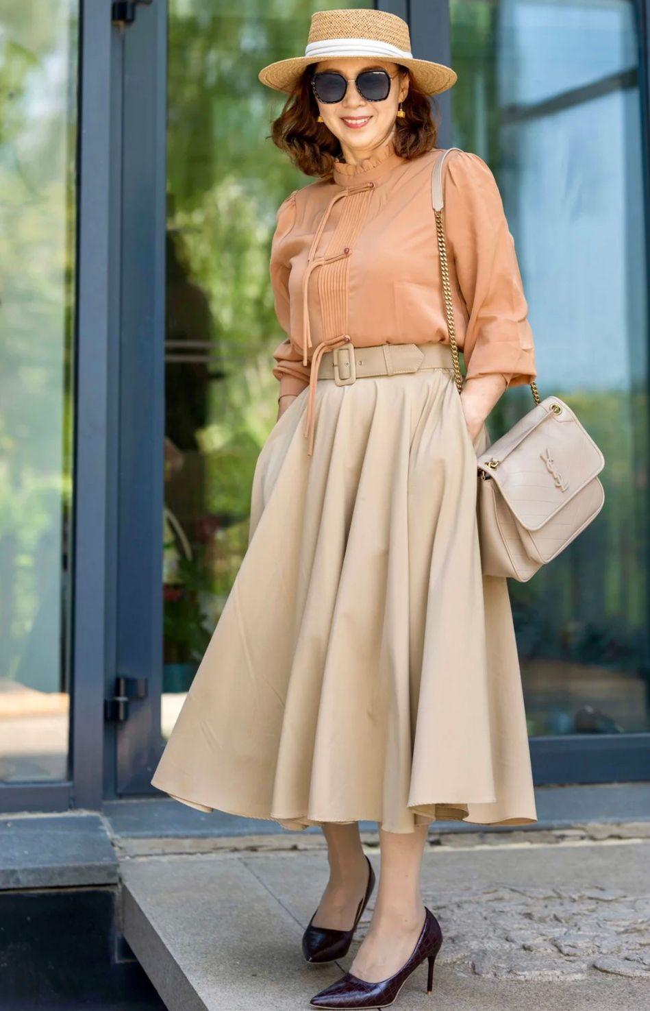 女性不要再认为上了年纪之后,就一定要穿“奶奶装”了,尤其是对于身材已经发福变得臃肿的女性来说,学会选择简约大气的服装,一定要比奶奶装来的更加时髦显气质。比如白色的基础款衬衫和半身裙的组合,就是知性优雅的代表,宽松有度的服装版型,对于身材的赘肉也很有包容性,能够隐藏住你的真实身材。