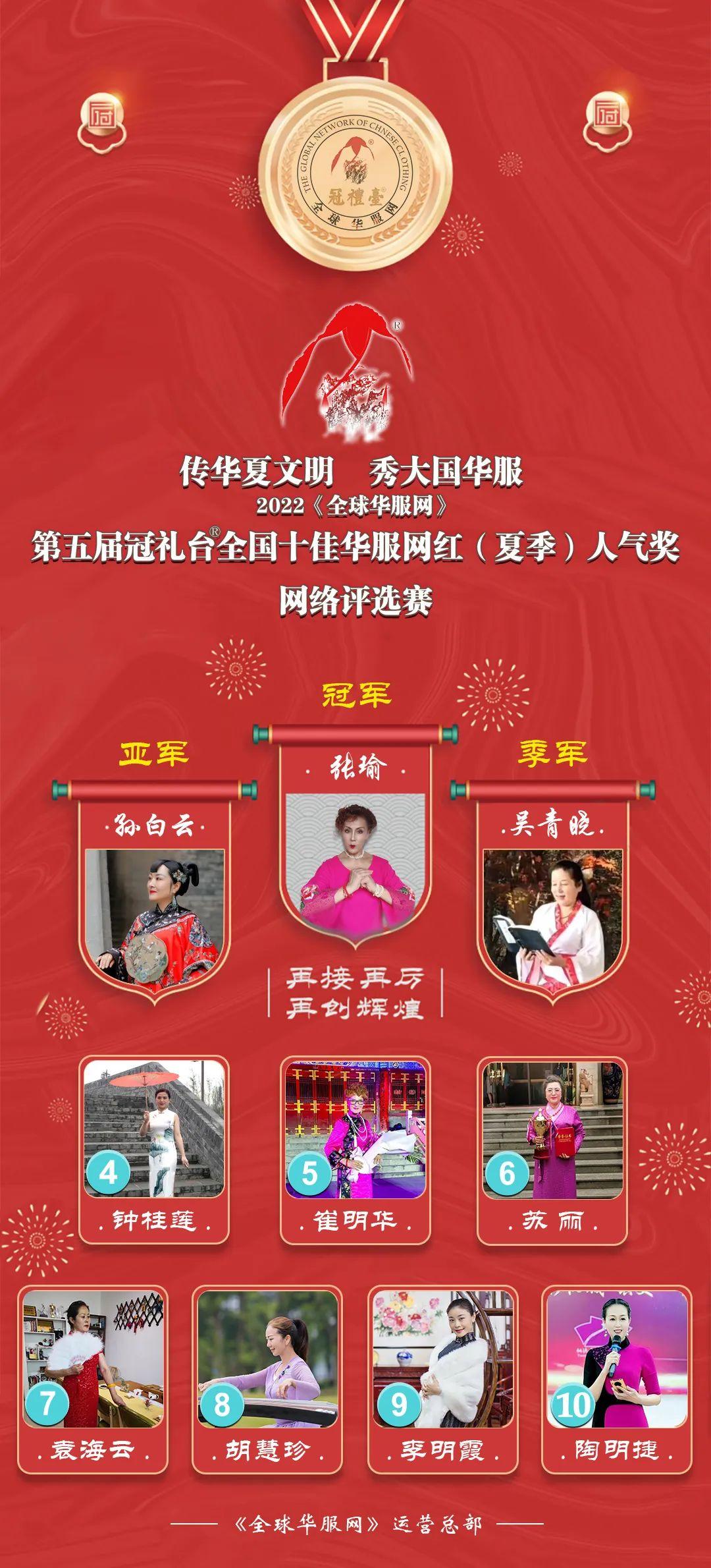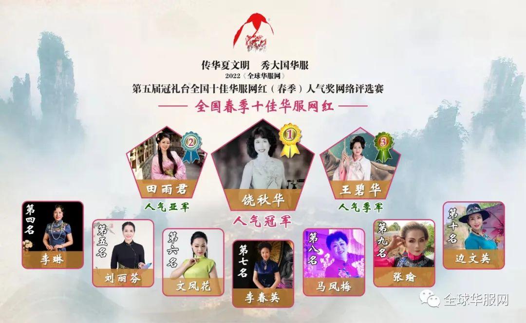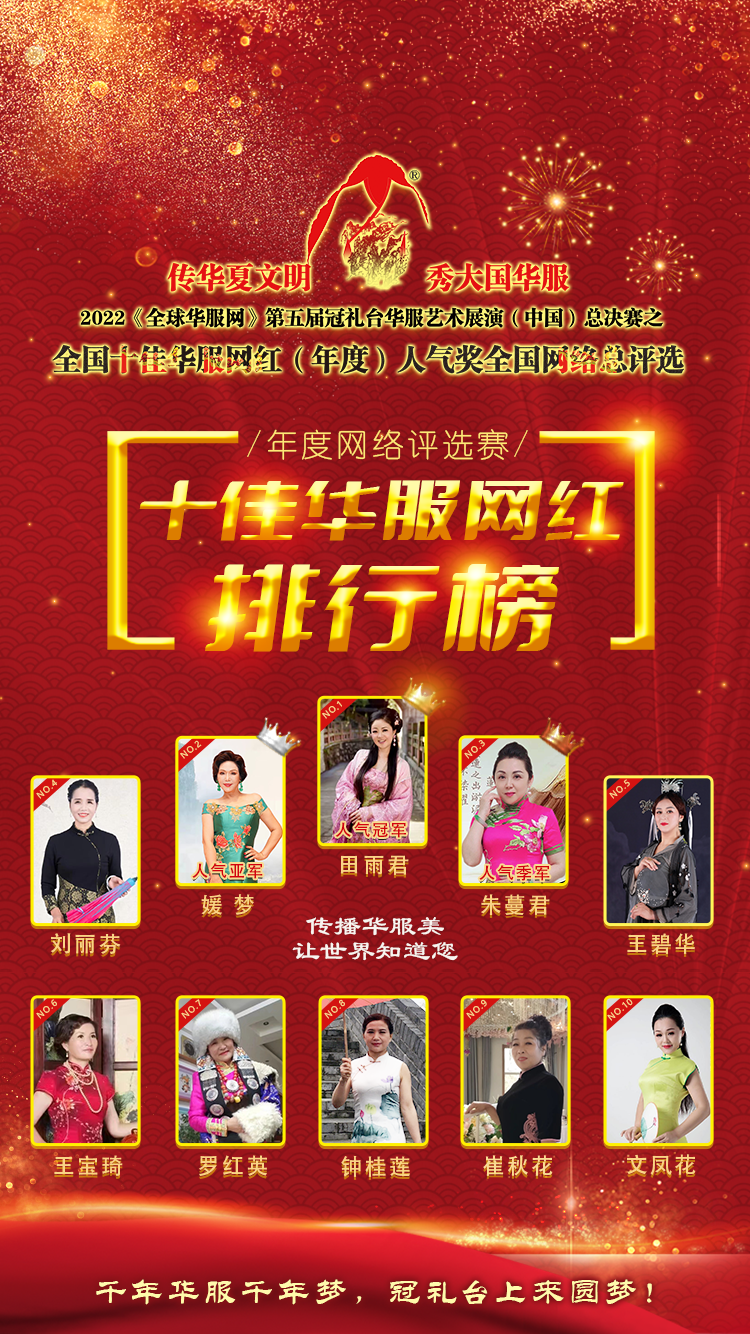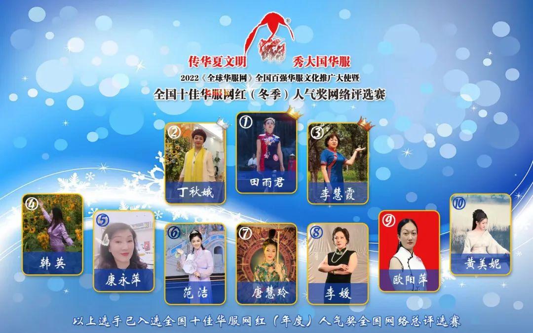 近日,走进《华服网》向世界讲述和演绎您的华服故事——2022《华服网》全国(年度)十佳华服网红人气奖网络评选赛评选结果成功出炉。其中,来自湖南湘西的田雨君女士荣获本届人气奖总,来自深圳的李媛女士荣获本届人气奖总亚军,来自香港的朱蔓君女士荣获本届总季军。