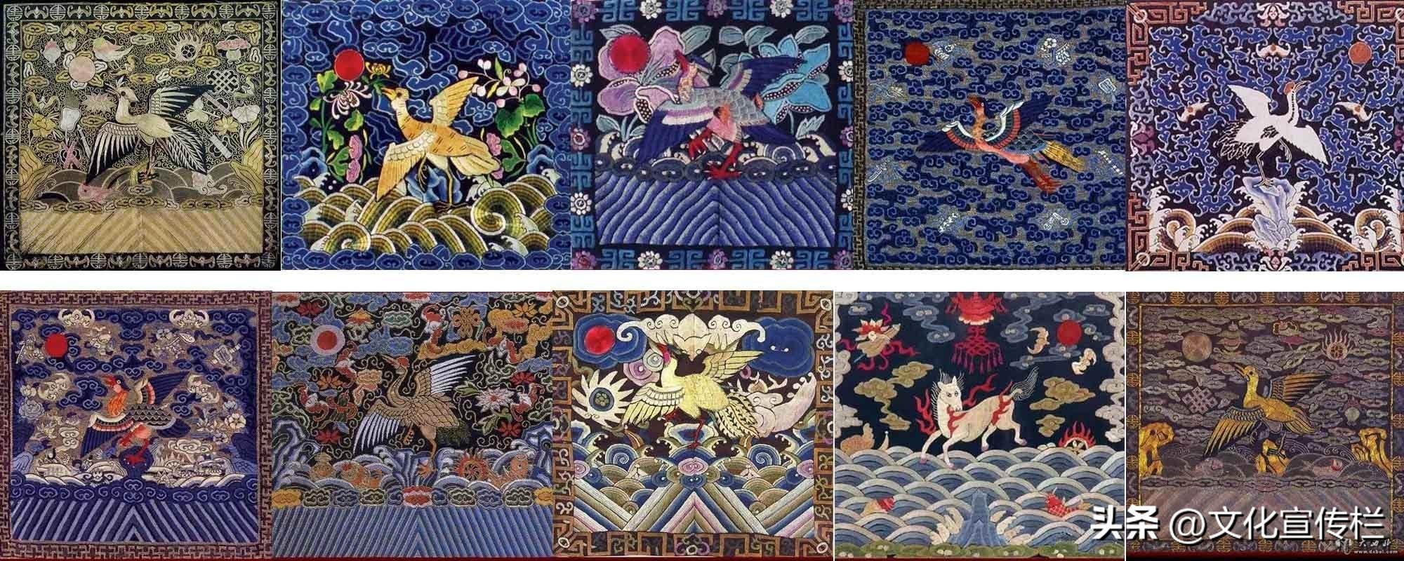 霞帔霞帔,是明清时期后妃、王公大臣的诰命夫人所常穿礼服的一部分,类似于现在的披肩。帔子早出现在南北朝时期,得名于隋唐时期,宋代时霞帔变成女子礼服的一部分,也成为女性社会身份地位一种标志;明代时发展成为“霞帔”。因为它的形状如同彩带,宽三寸二分,长五尺七寸,可以绕过脖颈,披挂在胸前,下端垂着金玉制成的坠子,美如彩霞。本来霞帔是宫廷命妇的着装,后来平民的女子在出嫁时也可穿戴霞帔。命妇的品级不一样,霞帔的颜色和图案纹饰也不同。如一、二品命妇的霞帔为蹙金绣云霞翟纹(翟是长尾山雉),三、四品为金绣云霞孔雀纹,五品绣云霞鸳鸯纹,六、七品绣云霞练鹊纹,八、九品绣缠枝花纹。
