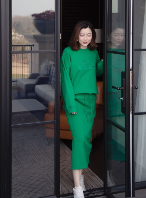 先来说说近两年流行的绿色吧,其实绿色也分为很多不同类型,有绿色,浅绿色,牛油果绿,这些颜色都是清新脱俗的,就像博主下面用这种绿色的卫衣凹造型,而且上下都是绿色,更加统一,也能够让你的造型变得协调一点。