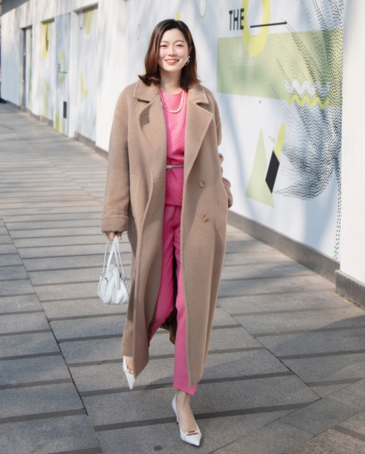 当你在穿这种较为亮眼的服装时,可以用一些比较基础的色彩来修饰,比如下面的咖色外套搭配着玫红色套装,就会显得较为协调,这种深浅结合的配色也更能营造出温柔的气质哦。
