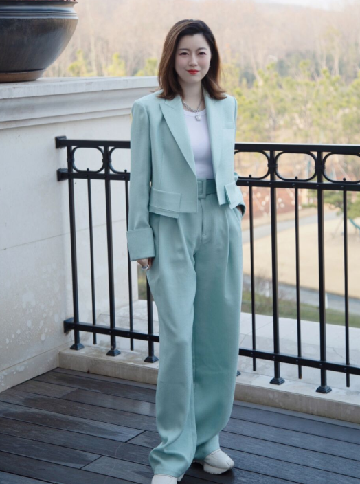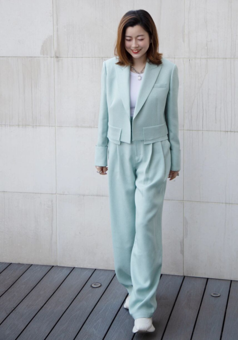 看得出来这位博主的皮肤很白,穿上这种薄荷绿色西装更加能展现出个人的皮肤优势,而且在西装里面搭配白色打底,这样的话会显得更轻盈,也能够在颜色上有所呼应,为气质加分。
