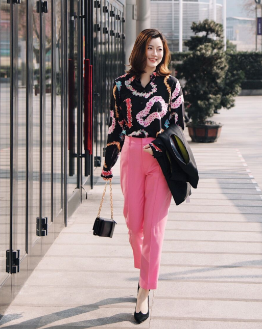 这种同色系的穿搭确实要协调很多,相对来说也不容易出错,很多人会觉得玫红色饱和度太高,不容易驾驭,上衣不知道如何挑选,你就可以用同色的搭配方式呀,上衣和裤子颜色一致,这样就会协调起来,而且你也可以用一些浅色的配饰修饰,避免单调。比如博主搭配白色鞋子,白色的珍珠项链以及白色包包,都会显得更清爽一些。
