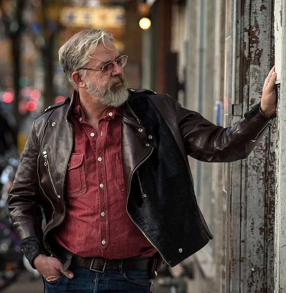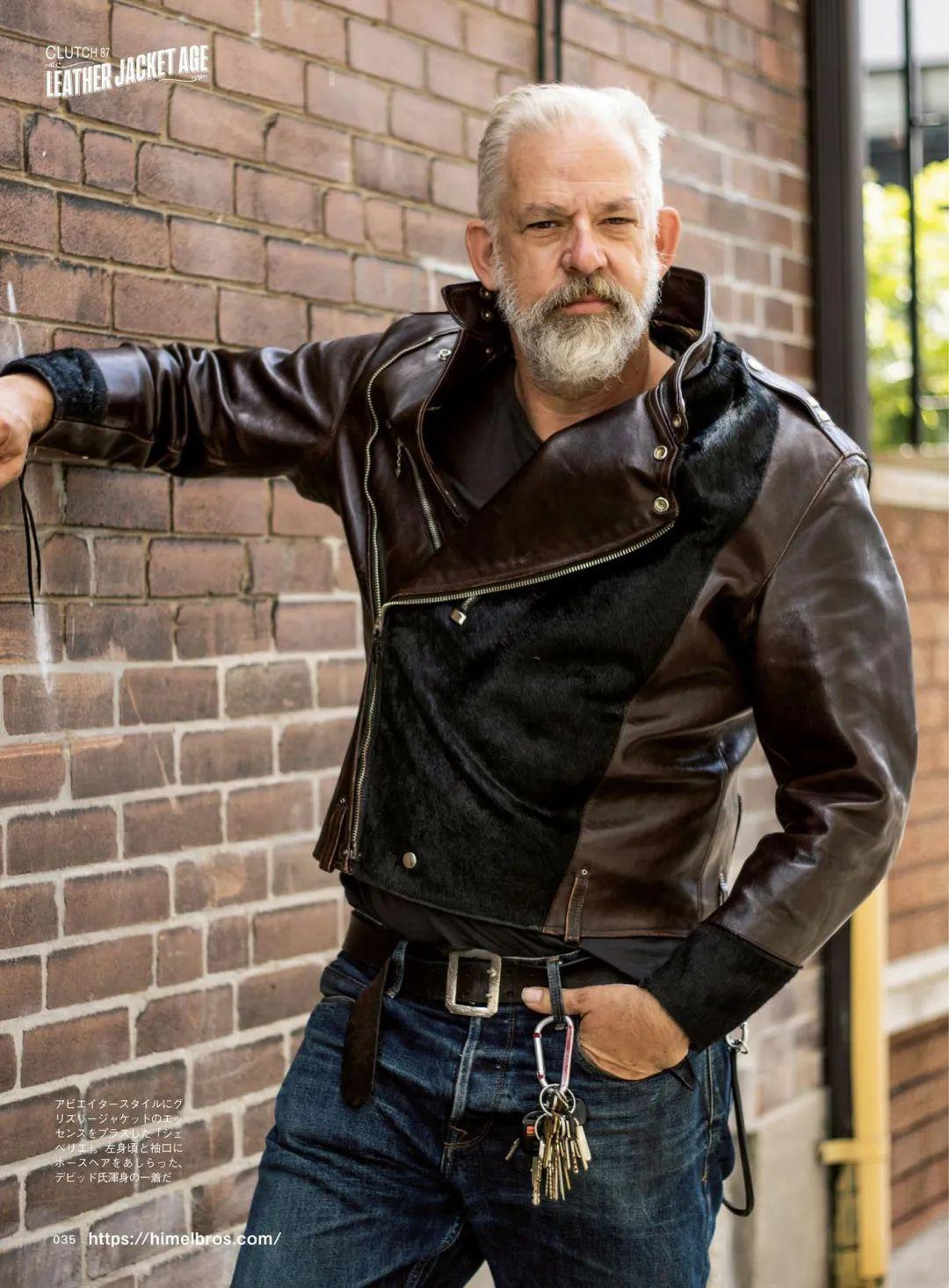 而对于皮衣爱好者一族而言,应该都听说过这位大神。好啦,不卖关子,正是别的加拿大皮革品牌 Himel Bros. Leather 的 Boss——David Himel。看这精致的银色络腮胡、面料特别的皮衣,还有那散发着叛逆不羁的硬汉气质,Uli 我寻思不把他请上《MAN OF THE WEEK》还真有点可惜了呢~