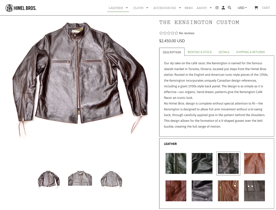 接下来,到了介绍 David Himel 制作的皮衣环节了。圈内老司机们应该有所听闻,Himel Bros. Leather 的皮衣向来给人高不可攀的印象,主要的原因是高昂的价格。Uli 在官网逛了一圈,发现一件皮衣低也需要 2650 美金,足以让人瞠目结舌。