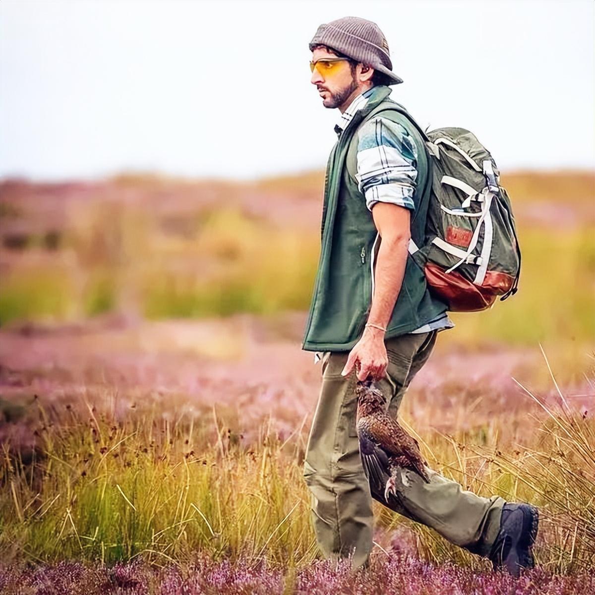 一身旅行装,一个运动登山尼龙包,在野外打猎,在户外奔跑。