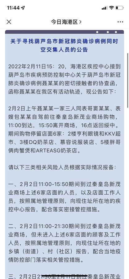 2月11日,葫芦岛市卫健委发布了多例确诊病例的行动轨迹,其中确诊的3名病例曾于2月2日驾车前往秦皇岛海港区新茂业商场购物。极目新闻记者看到,2月12日,秦皇岛海港区疾病预防控制中心新公告显示,11日下午区疾控中心已接到关于葫芦岛确诊病例聂某某密切接触者的协查函。2月2日上午,聂某某一家3人同表哥、表嫂5人自驾前往秦皇岛新茂业商场购物,11时到达,15时50分离开商场,16时返回绥中。购物期间停留店面6家:2楼亨利眼镜和KKV超市、3楼DQ奶茶店、慕容说服装店、5楼胖哥俩肉蟹煲和ARTEASG奶茶店。