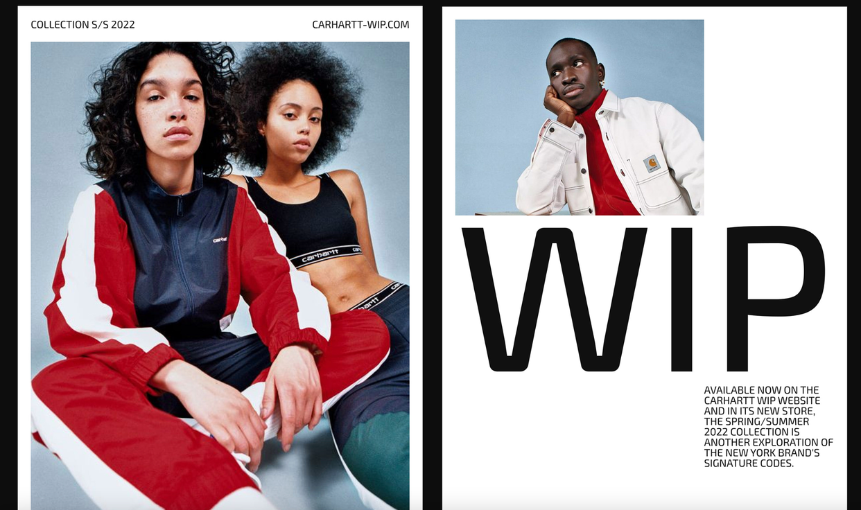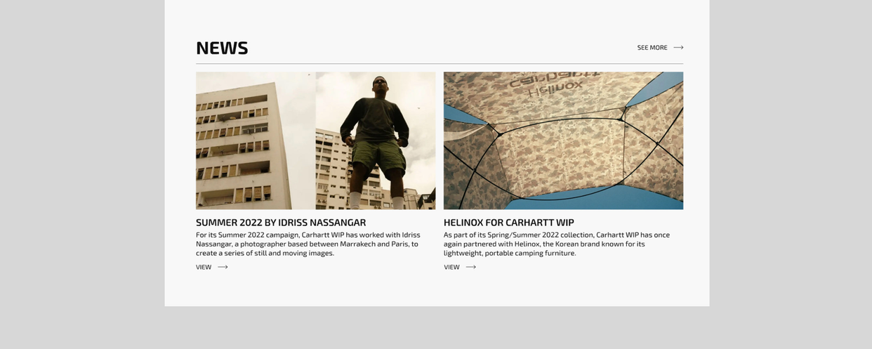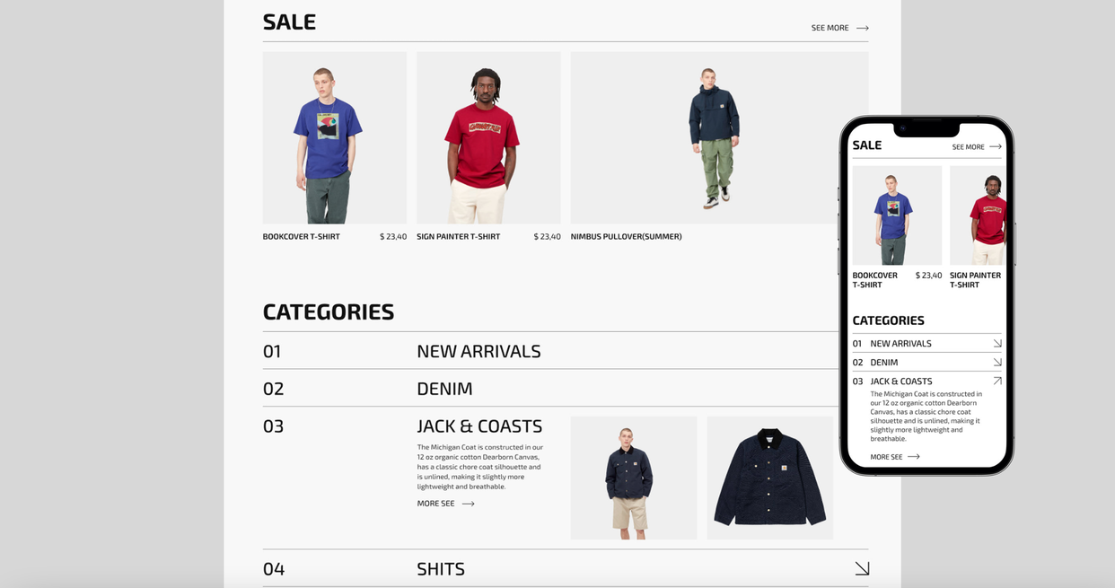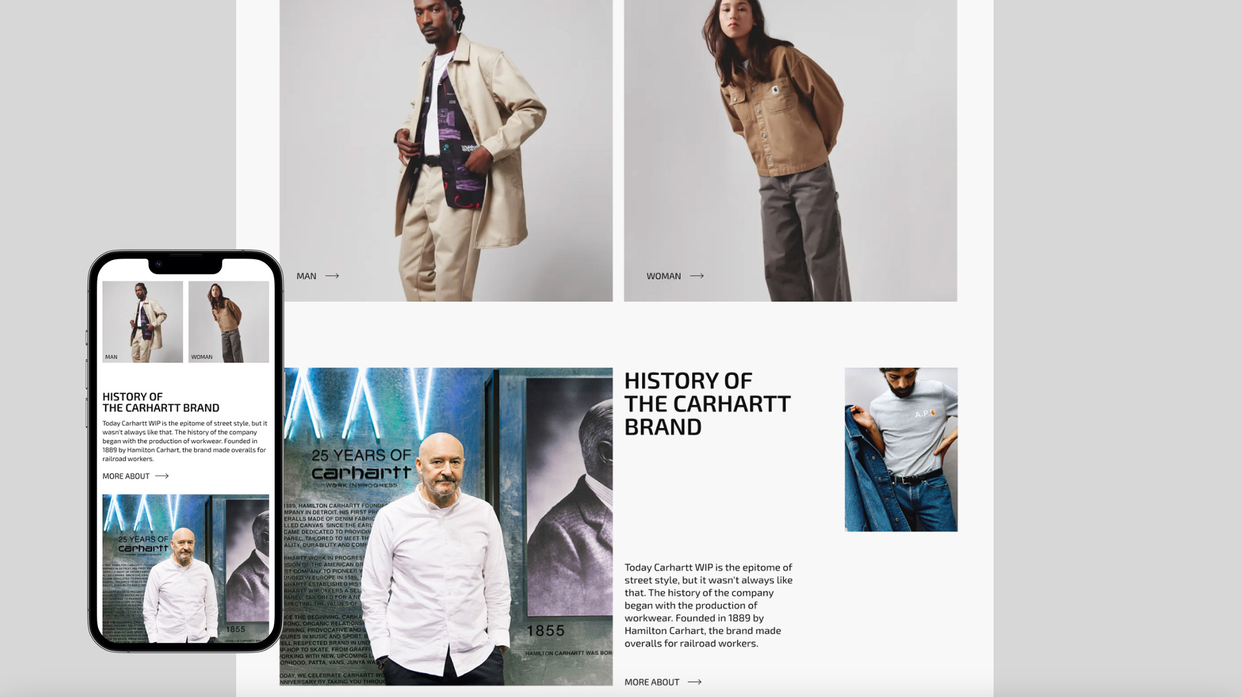 再下来是一些分类,这个分类的话就就比较常见了,我们我们一般国内的品牌网站分类不会这样放,它这里放是从上到下放有一定的局限性,但它的出彩的地方是它交互的部分,它在这个横向的信息里边展开之后,会看到这一系列的简单介绍,一个摸细的按钮,再加上两张经典图。再下来的话是大类的两个图,两个封面图,一个男装,一个女装。