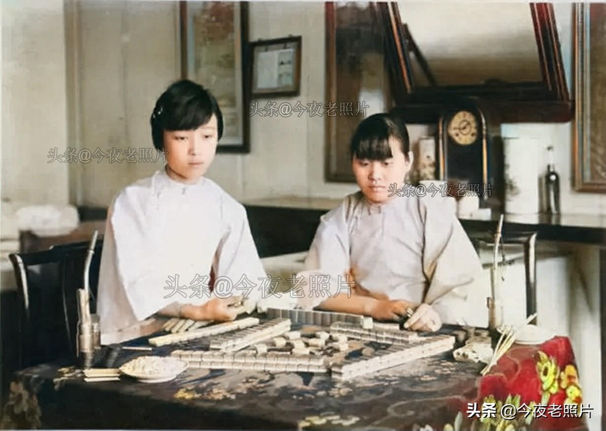 02、1924年,辽宁大连麻将桌旁,两个民国女子为拍这张摆拍照,把饭都冷凉了,看她们的表情满脸的埋怨。据说,张作霖在皇姑屯出事前,还玩了通宵的麻将。