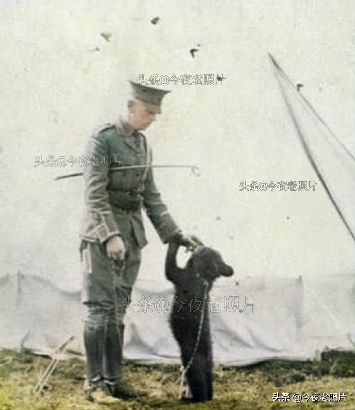19、1914年,一战战场上,英军在军营外牵着狗熊巡逻。据说,狗熊与狗的忠实度差不多,也很聪慧与憨态可掬。人们之所以不愿养狗熊是因为它是夜行动物,与正常人的生物钟相悖,且饭量大得惊人。