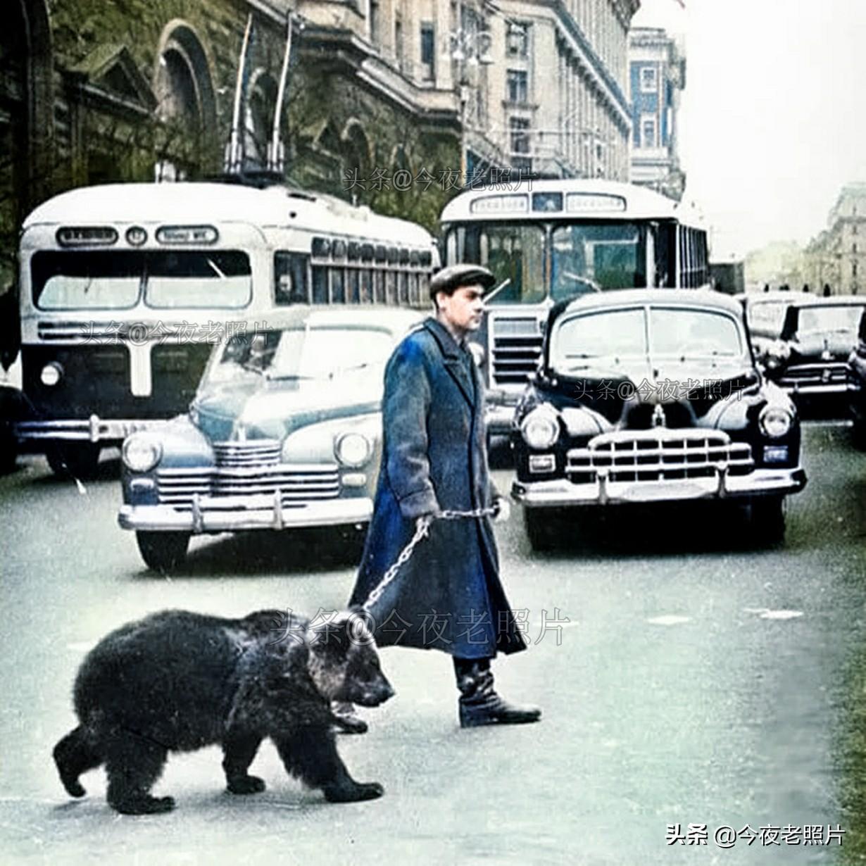 21、1963年,莫斯科街头,战斗民族遛狗熊也是这么彪悍,无惧汽车,也不走斑马线,莫非当时就有“礼让行人”之说?