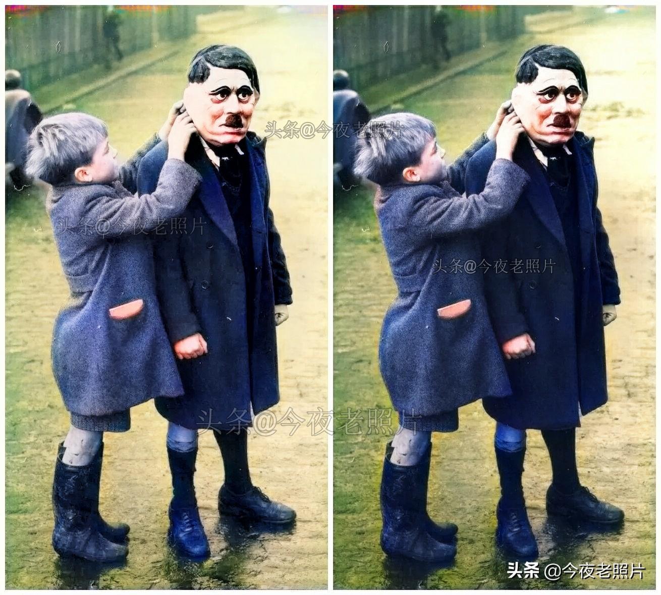 09、1938年,英国大街上,孩子们戴着“希特勒”的面具互相捉弄。当时德英尚未开展,但双方也都在积极备战。