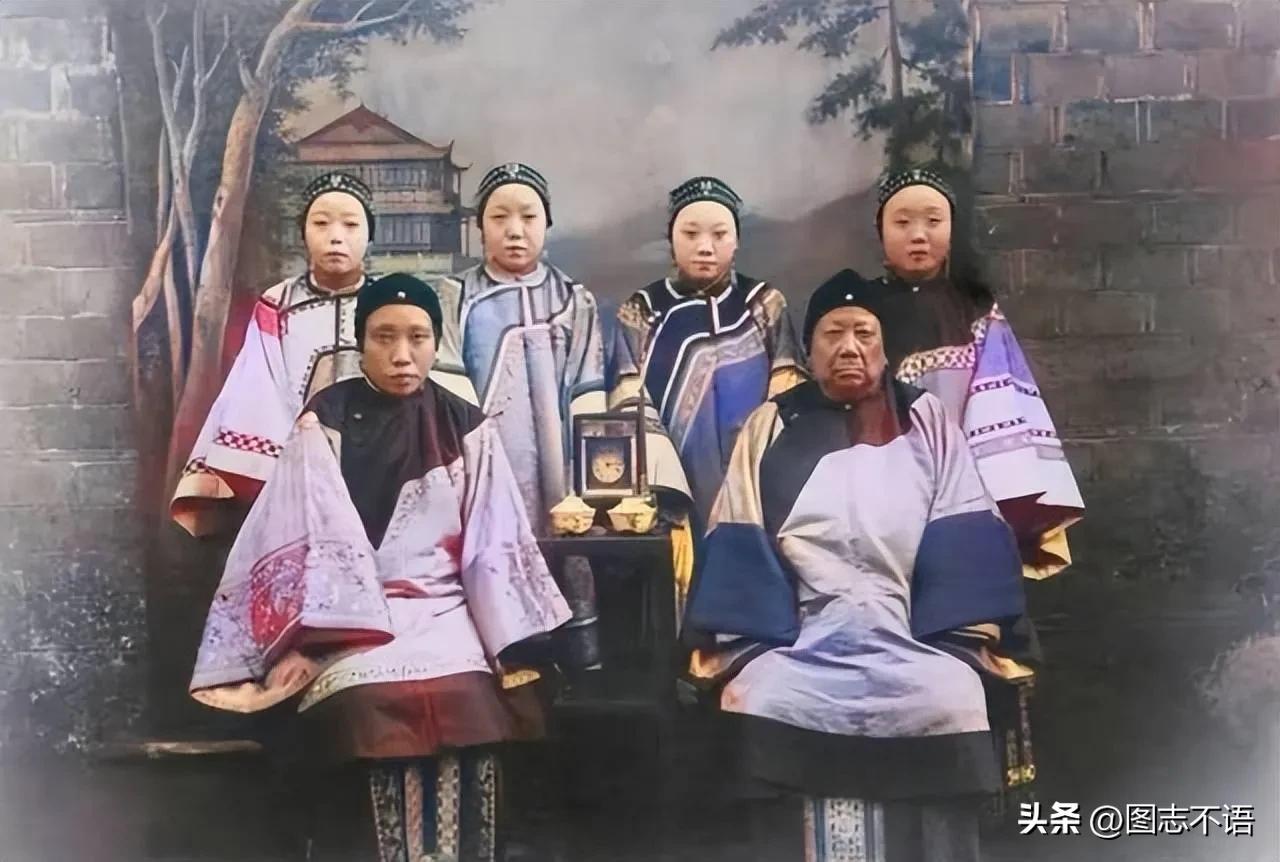 大户人家的妻妾这六名女子是清末大户人家的妻子和小妾,从她们严肃的表情和站位能看出这个家庭中不同地位之间的等级森严。