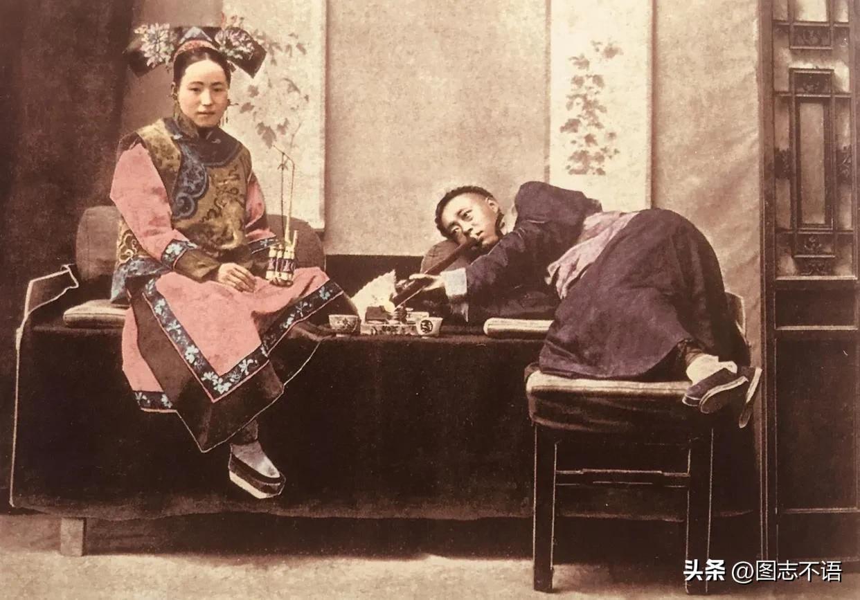 吸大烟(鸦片)的夫妻这是一对在家中吸大烟的满族夫妇,丈夫躺在炕上正在抽着大烟,面容姣好的妻子坐在炕上微笑地看着镜头。因为满族女人不缠足,所以看着脚掌比较大。